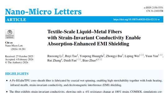 近日,beat365官网化工学院范代娣教授、李若松副教授团队联合复旦大学等单位,围绕柔性可穿戴电子在大形变条件下面临的导电衰减等难题,提出并构筑了一种同轴湿法纺丝结合冻压活化的液态金属纤维策略。团队构建了Fe-EGaIn/TPU核-壳液态金属纤维及其织物平台,实现高导电与超高延展,并具备应变不敏感导电,同时在织物形态下获得吸收占优的电磁屏蔽能力。此外,依托低电压可控焦耳热与红外热信号抑制,该织物可面向生物与可穿戴应用拓展...