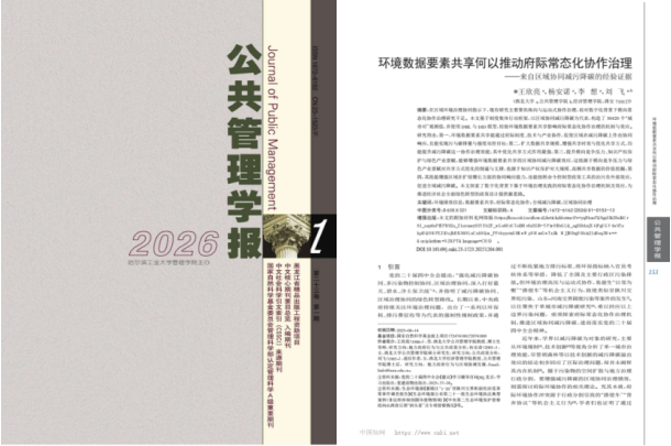 近日,beat365官网公共管理学院王欣亮教授团队撰写的论文《环境数据要素共享何以推动府际常态化协作治理——来自区域协同减污降碳的经验证据》在《公共管理学报》2026年第1期正式发表。该文是王欣亮教授主持的国家自然科学基金面上项目(72474180、72074180)的阶段性研究成果。党的二十届四中全会审议通过的《中共中央关于制定国民经济和社会发展第十五个五年规划的建议》明确提出,要“健全生态文明制度体系,完善区域协同治理机制,...