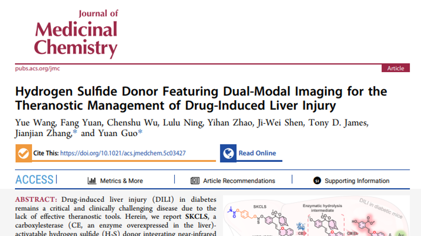 近日,beat365官网郭媛教授/张健健教授团队在糖尿病并发药物性肝损伤(DILI)的诊疗一体化研究中取得重要进展。该团队成功构建了一种羧酸酯酶(CE)激活型硫化氢(H₂S)供体(SKCLS)分子药物策略,该策略同时集成了近红外荧光(NIRF)与化学发光(CHL)双模态成像功能,可实现对糖尿病小鼠模型中DILI进程的精准可视化监测与有效治疗,为临床解决糖尿病用药所致肝毒性问题提供了新的方案。糖尿病作为全球性代谢疾病,其长期药物治疗(...