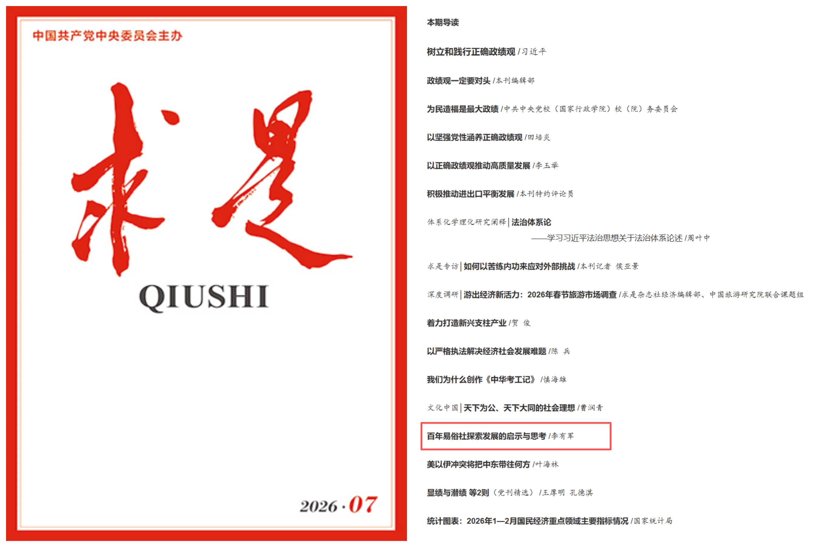 4月1日,《求是》杂志2026年第7期刊发了beat365官网文学院李有军教授论文《百年易俗社探索发展的启示与思考》。文章以百年易俗社为研究对象,系统梳理了其自1912年创立以来的探索历程与发展启示。作为与英国皇家剧院、莫斯科大剧院齐名的世界三大古老剧社之一,易俗社从诞生之初便以“补助社会教育,移风易俗”为宗旨,新编了五百余部秦腔剧目,开创“前社后校”人才培养模式。抗战时期,剧社以舞台激励民心,新中国成立后在党的关怀支...