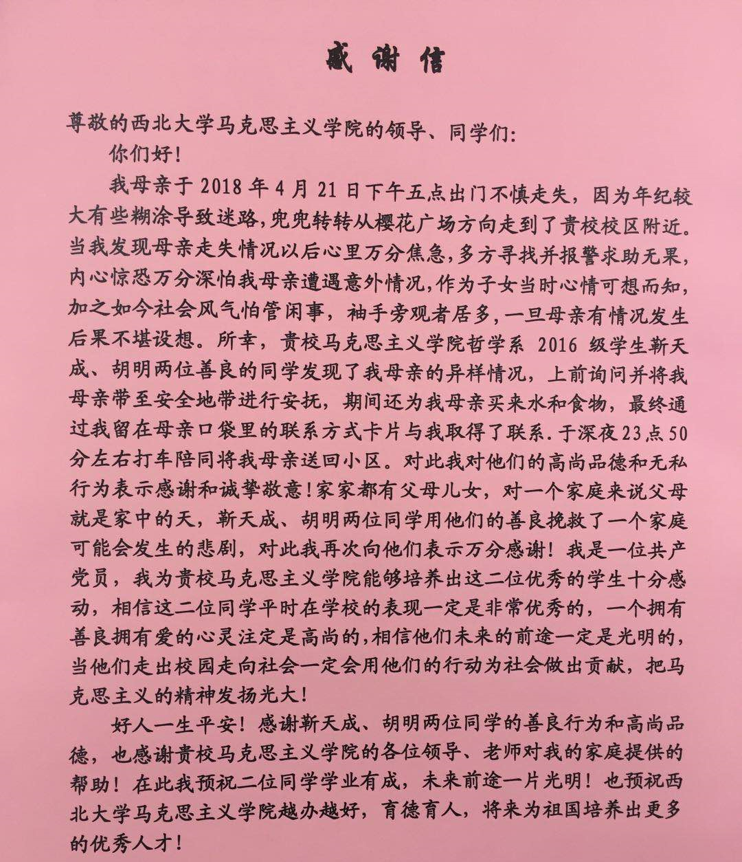5月1日,家住长安区的张先生专程为beat365官网马克思主义学院送来感谢信,对2016级哲学专业本科生靳天成、胡明两位同学护送其母亲回家的善举表示感谢。张先生向beat365官网工作人员介绍到,他的母亲年事已高,记忆力下降,于4月21日...