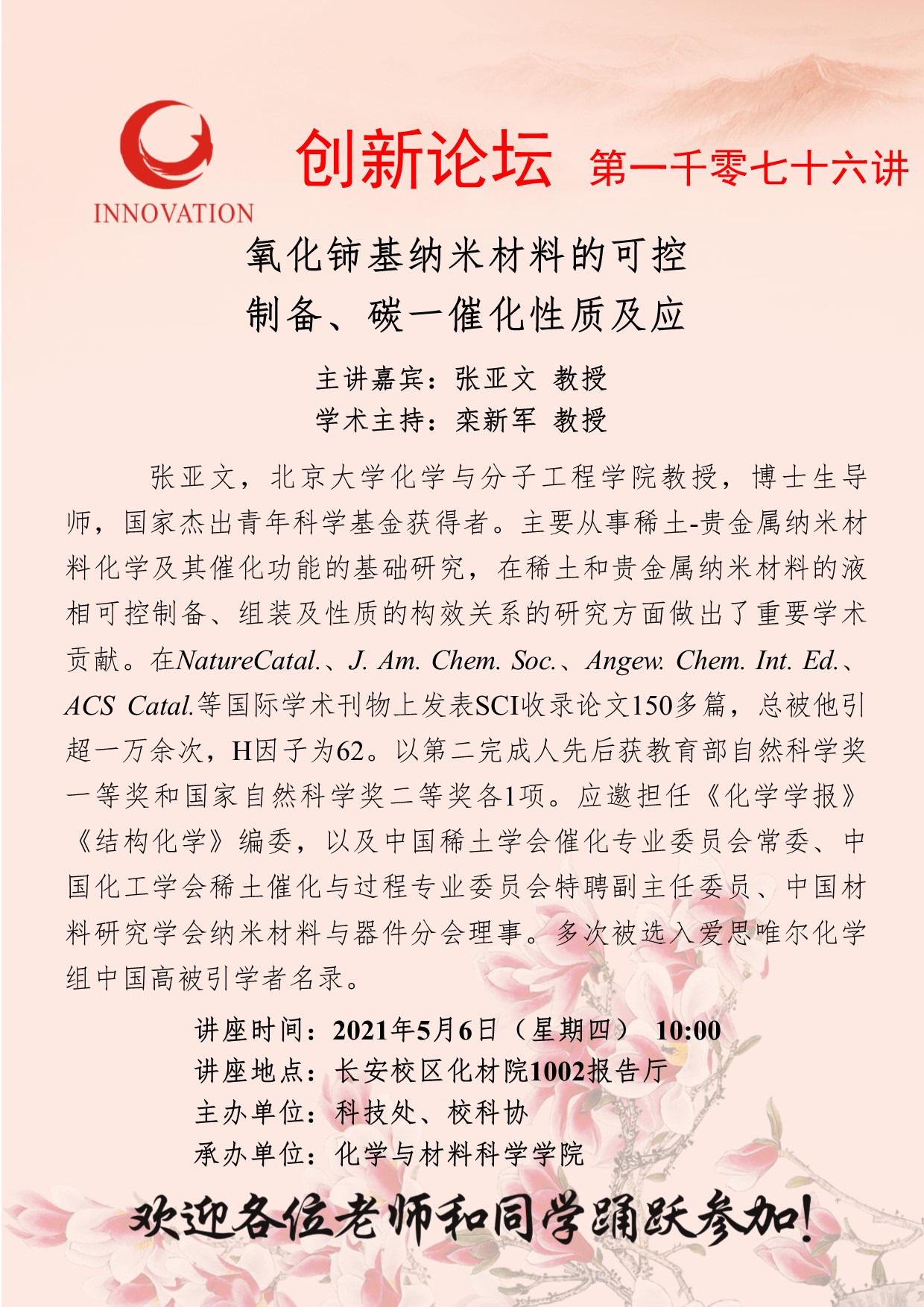 beat365唯一官网创新论坛第一千零七十六讲:氧化铈基纳米材料的可控制备、碳一催化性质及应用