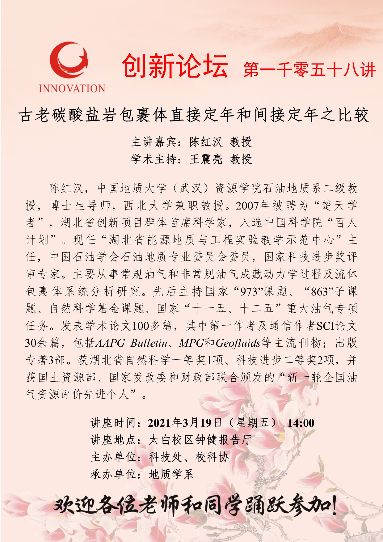 beat365唯一官网创新论坛第一千零五十八讲:古老碳酸盐岩包裹体直接定年和间接定年之比较
