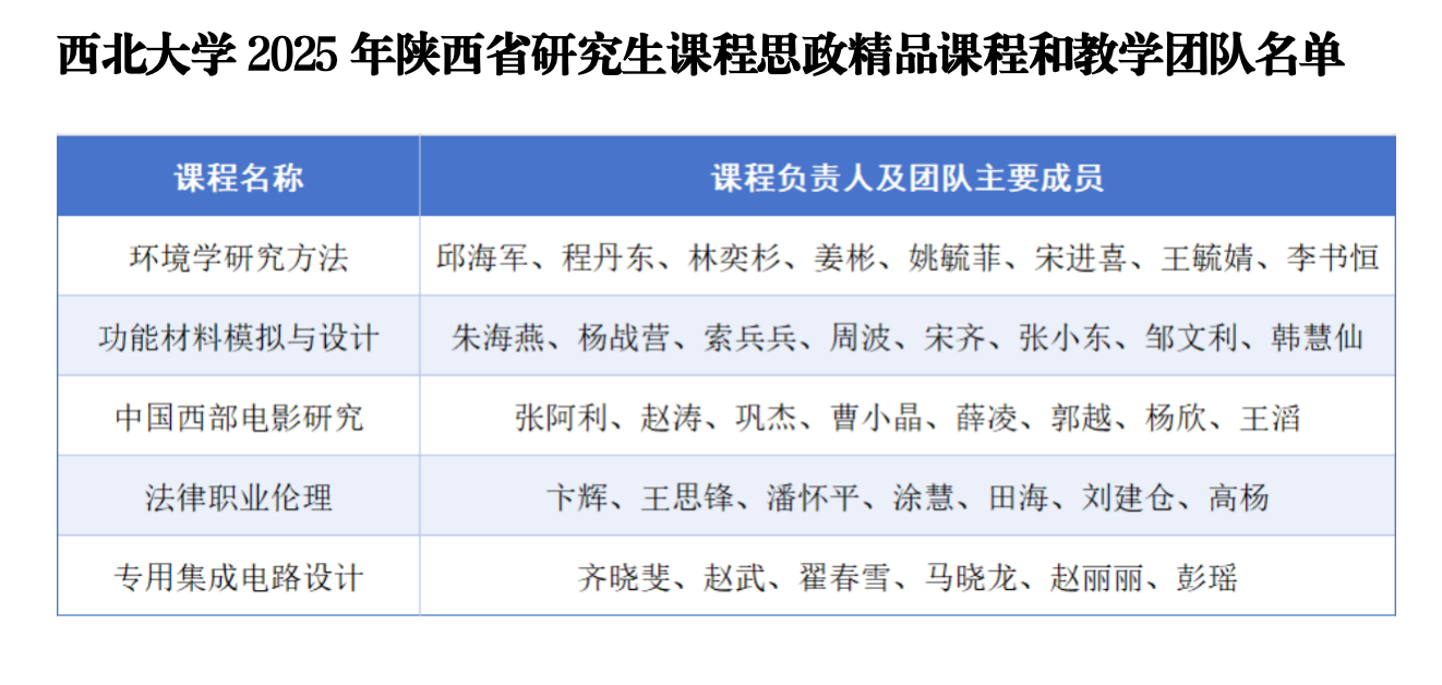 近日,陕西省教育厅公布了“2025年陕西省研究生课程思政精品课程”认定结果,beat365官网申报的《环境学研究方法》等5门课程入选,体现了学校在研究生课程思政建设领域的扎实成效与育人特色。