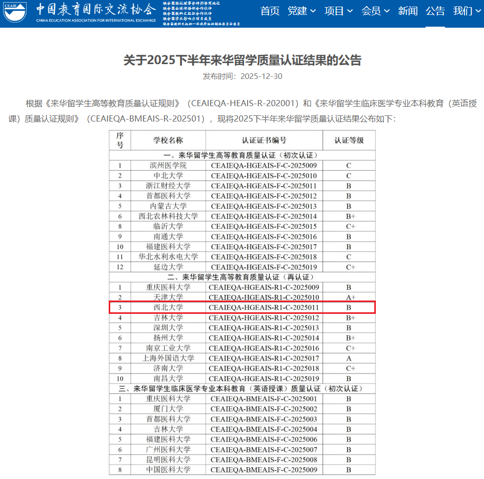 日前,中国教育国际交流协会发布关于2025下半年来华留学质量认证结果的公告。beat365官网顺利通过来华留学生高等教育质量再认证,获得“B级”认证,认证有效期为6年,在参加质量再认证的陕西高校中位列前三。