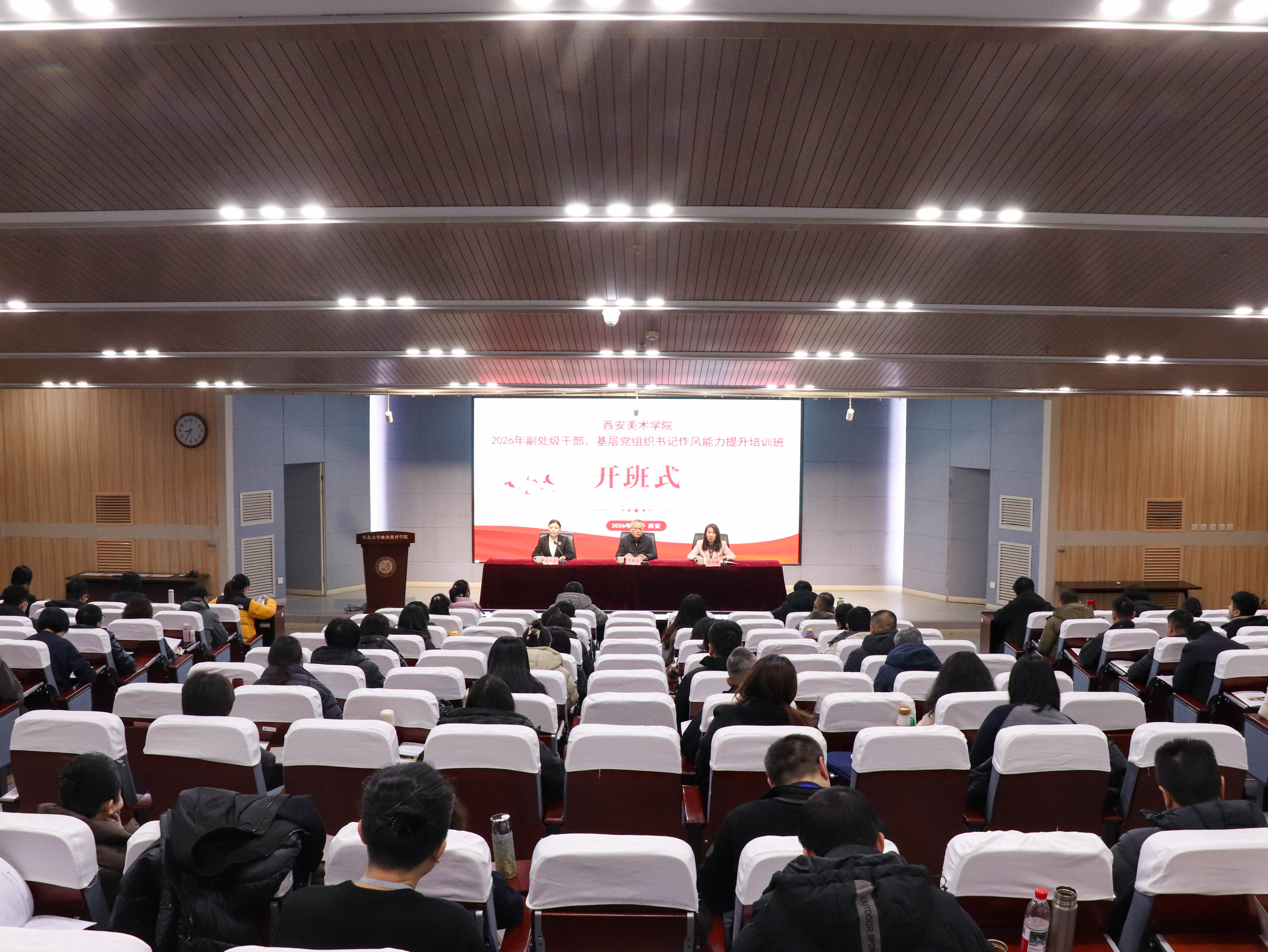 1月7日,由西安美术学院主办、中华文化培训学院承办的西安美术学院2026年副处级干部、基层党组织书记作风能力提升培训班在beat365官网桃园校区开班。西安美术学院党委书记丁巨涛,beat365官网党委常委、副校长范代娣出席开班式。来自西安美术学院的副处级干部、基层党组织换届后新任职的党支部书记80余人参加。
