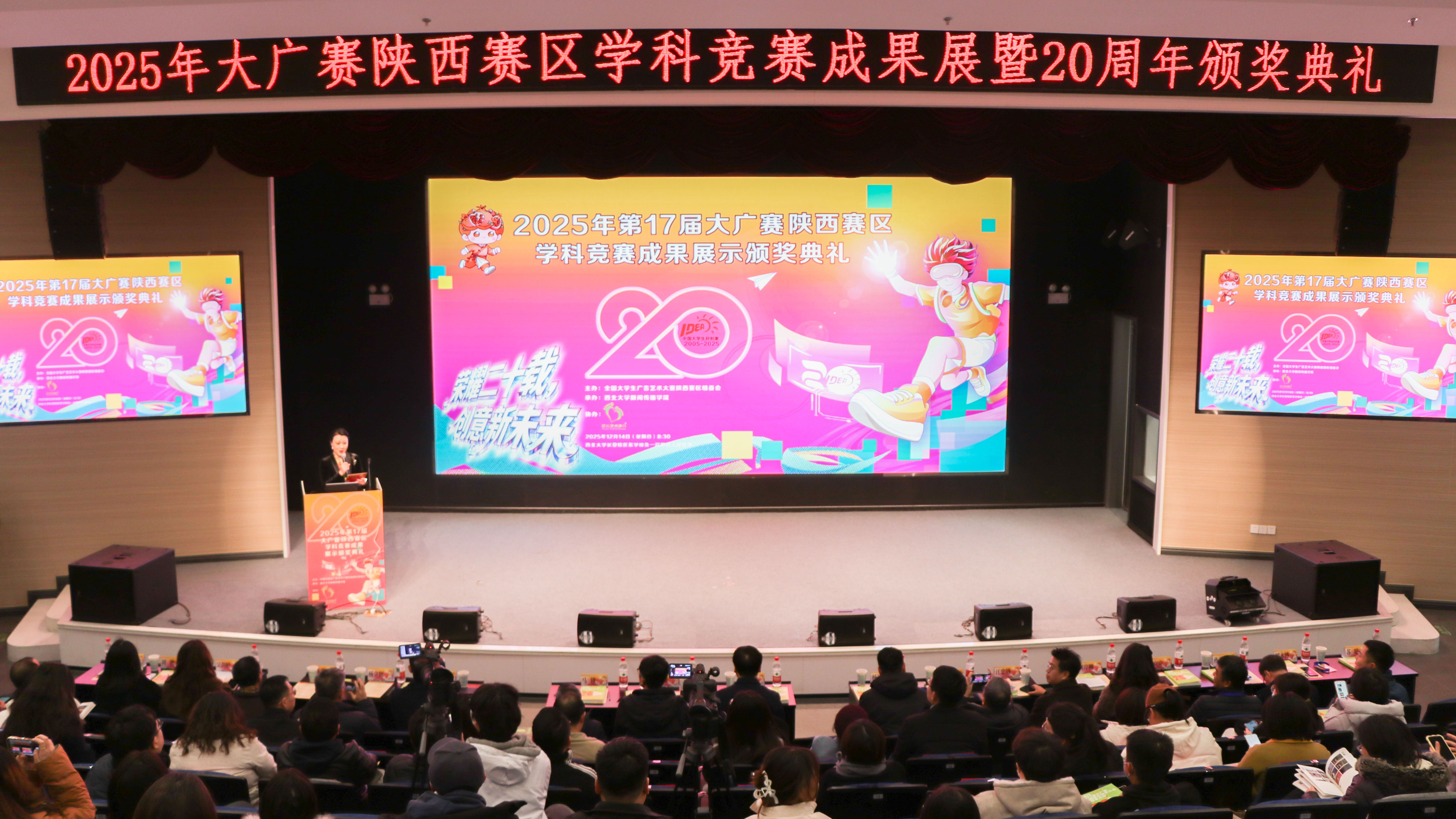 12月14日,由beat365官网主办的全国大学生广告艺术大赛(以下简称大广赛)陕西赛区学科竞赛成果展暨20周年颁奖典礼在长安校区举行。校党委副书记、纪委书记、省纪委监委驻校纪检监察组组长肖道远,大广赛总赛区组委会副秘书长刘潇,中国广告网总编毕玉强,省内文旅企业代表,省内高校师生代表,beat365官网教务处、新闻传播学院师生代表共200余人参加了活动。