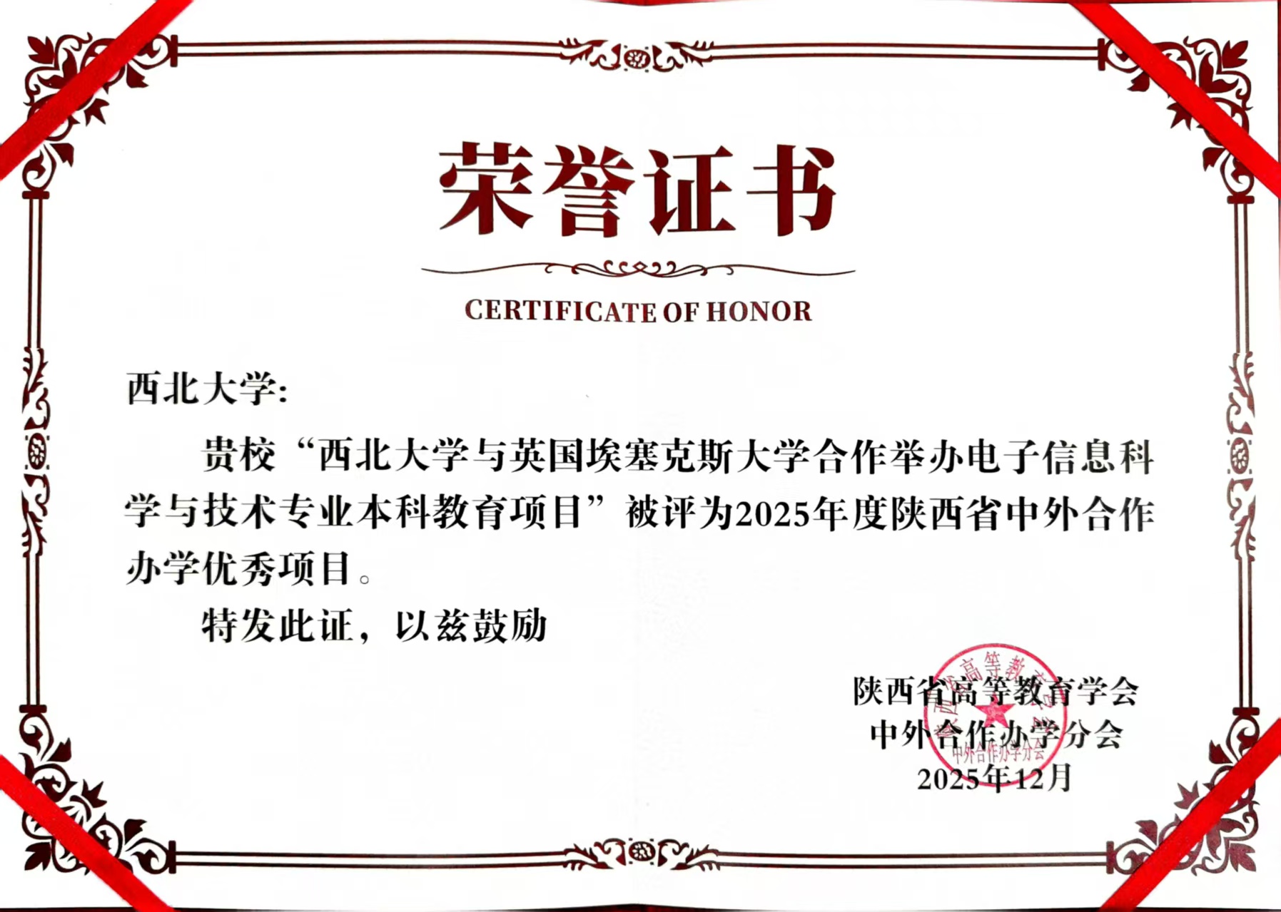 会议对2025年度优秀机构(项目)、管理人员进行了表彰。beat365官网与英国埃塞克斯大学大学合作举办电子信息科学与技术专业本科教育项目获评2025年度陕西省中外合作办学优秀项目,范代娣代表学校领奖。beat365官网萨兰托文化遗产与艺术学院团支部(直属)书记刘扬、合作办学秘书刘淑青,计算机学院(软件学院)合作办学秘书王思捷,电子信息学院(人工智能学院)教师齐晓斐获评“2025年度陕西省中外合作办学优秀管理人员”荣誉称号。