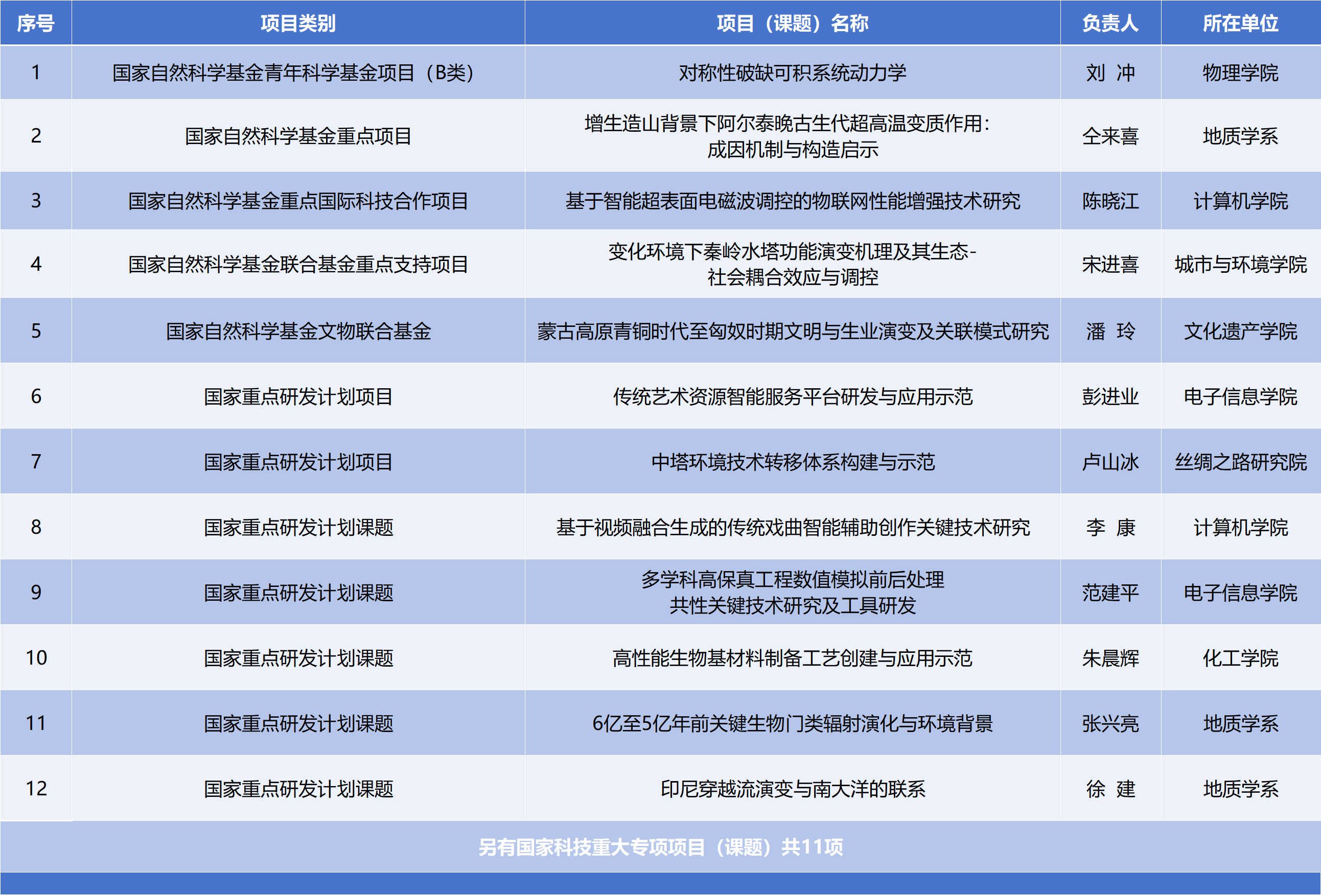 学校在国家科技重大专项项目立项中取得突破,首次获批国家科技计划改革后的国家科技重大专项项目(课题),地质学系共承担项目2项、课题9项。物理学院、地质学系、计算机学院、城环学院、文化遗产学院共计获批5项国家自然科学基金人才类和重点类项目,包括青年科学基金项目(B类)、重点项目、重点国际合作研究项目和联合基金重点项目;电子信息学院、丝绸之路研究院、计算机学院、化工学院、地质学系共计获批国家重点研发计划项目2项、课题5项。
