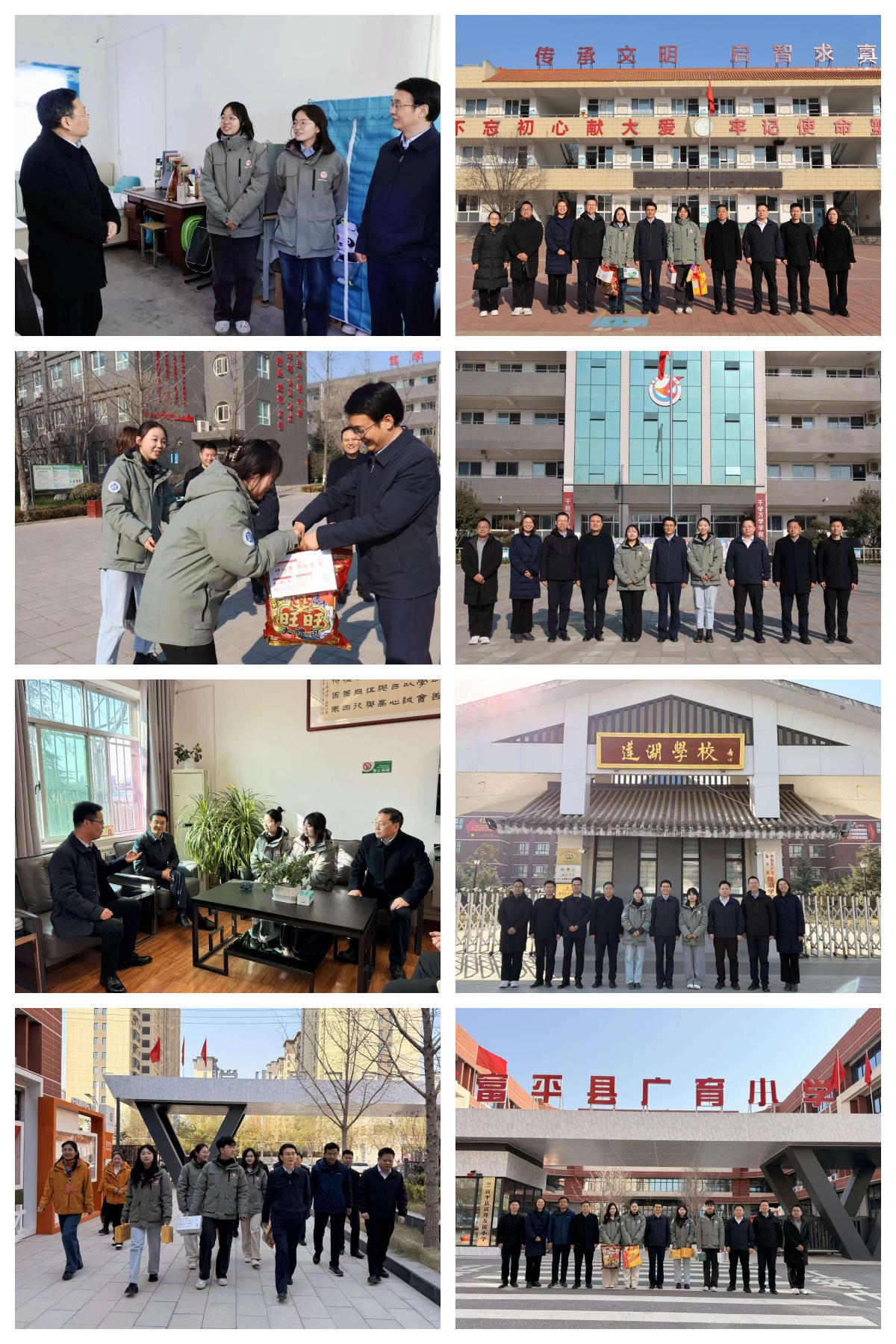 张远军一行先后来到刘集镇中心小学、东上官小学、莲湖学校、广育小学,详细查看了服务学校环境、志愿者的办公及住宿条件,细致了解志愿者们到达服务地以来的工作和生活情况,给志愿者们在冬日里带来了学校的暖心关怀。