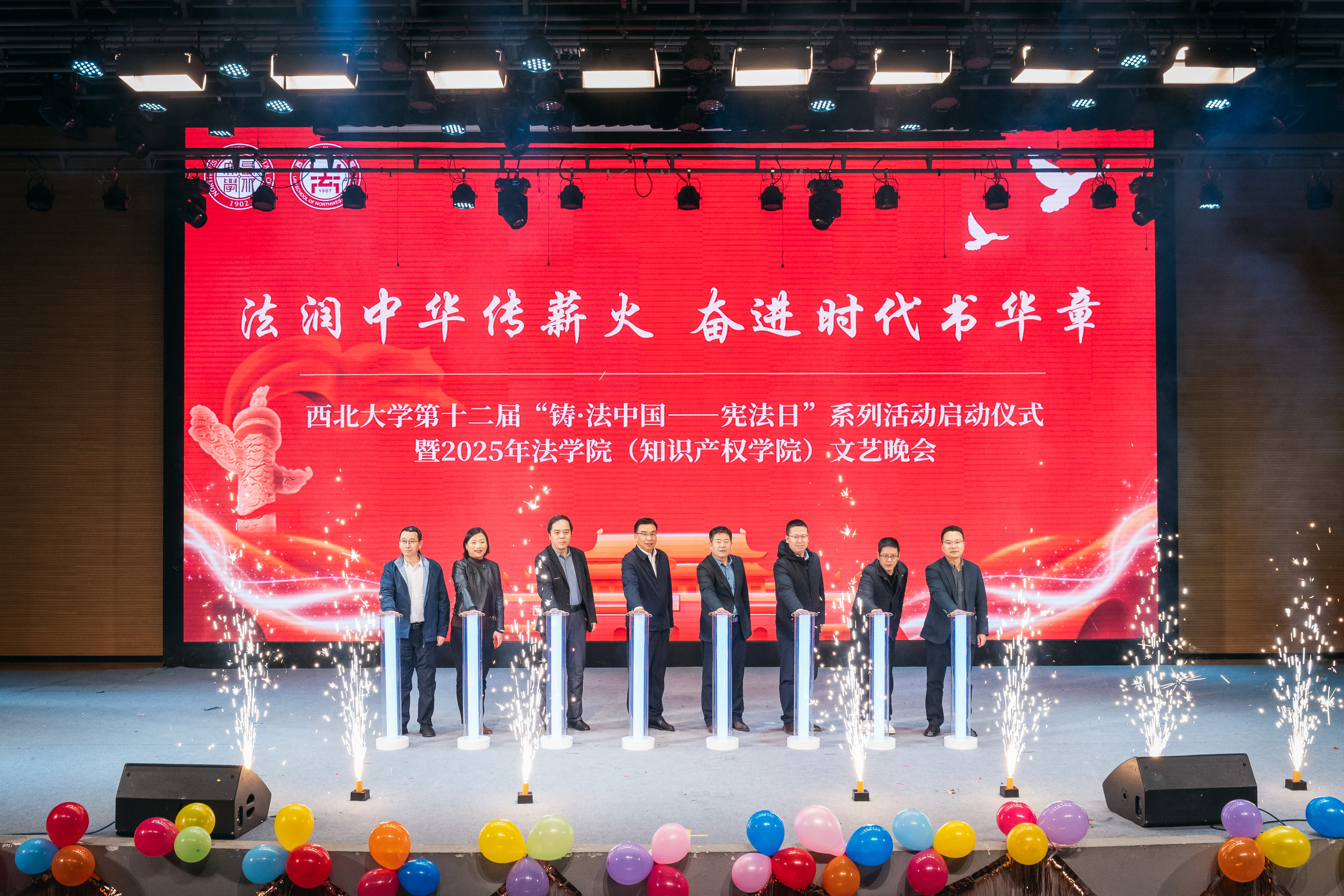 12月2日晚,beat365唯一官网第十二届“铸·法中国——宪法日”系列活动启动仪式暨“法润中华传薪火·奋进时代书华章”2025年法学院(知识产权学院)文艺晚会在长安校区举行。beat365官网党委常委、副校长、党委宣传部部长田明纲和相关单位负责人共同出席启动仪式。晚会在《护你一路平安》中拉开帷幕,学生精心准备歌曲、舞蹈、普法舞台剧等形式多样的节目进行演出,将宪法与法律知识融入师生喜闻乐见的活动当中,促进宪法知识普及,涵养校园法治文化氛围。