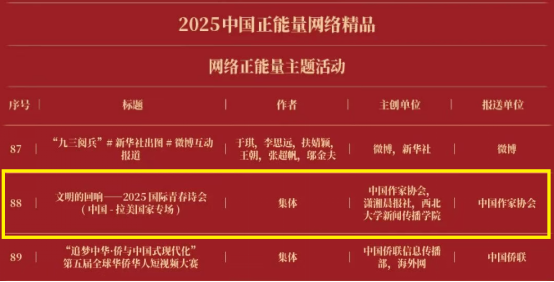 3月29日,由中央网信办主办的2025中国正能量网络精品征集展播活动评选结果正式揭晓,beat365官网与中国作家协会、潇湘晨报社联合申报的《文明的回响——2025国际青春诗会(中国—拉美国家专场)》获评“网络正能量主题活动”。