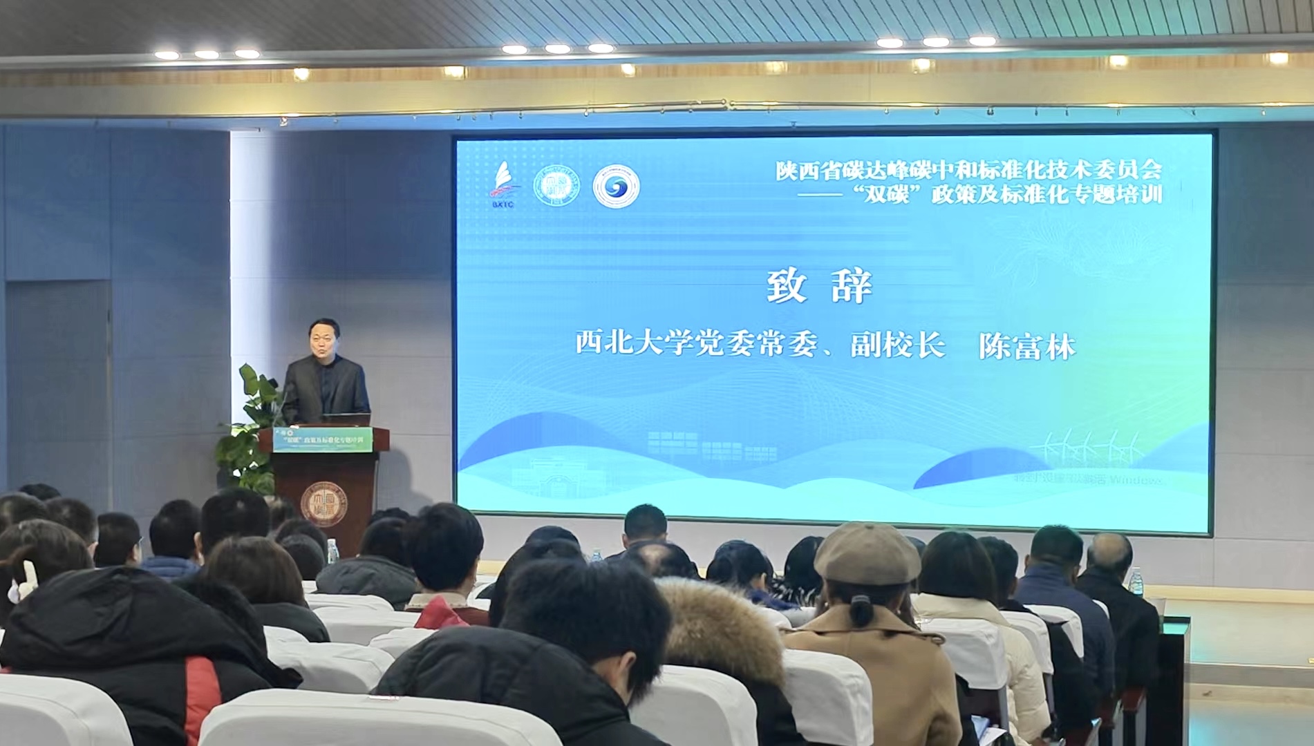 1月19日,陕西省碳达峰碳中和标准化技术委员会(简称省“双碳”标委会)“双碳”政策及标准化专题培训在桃园校区举行。校党委常委、副校长陈富林,陕西省节能中心主任贾宝舍,陕西省市场监督管理局标准化管理处三级调研员丁志刚以及我省相关政府部门、企事业单位、科研院所、高校及社会团体的领导和专家共150余人参加了活动。