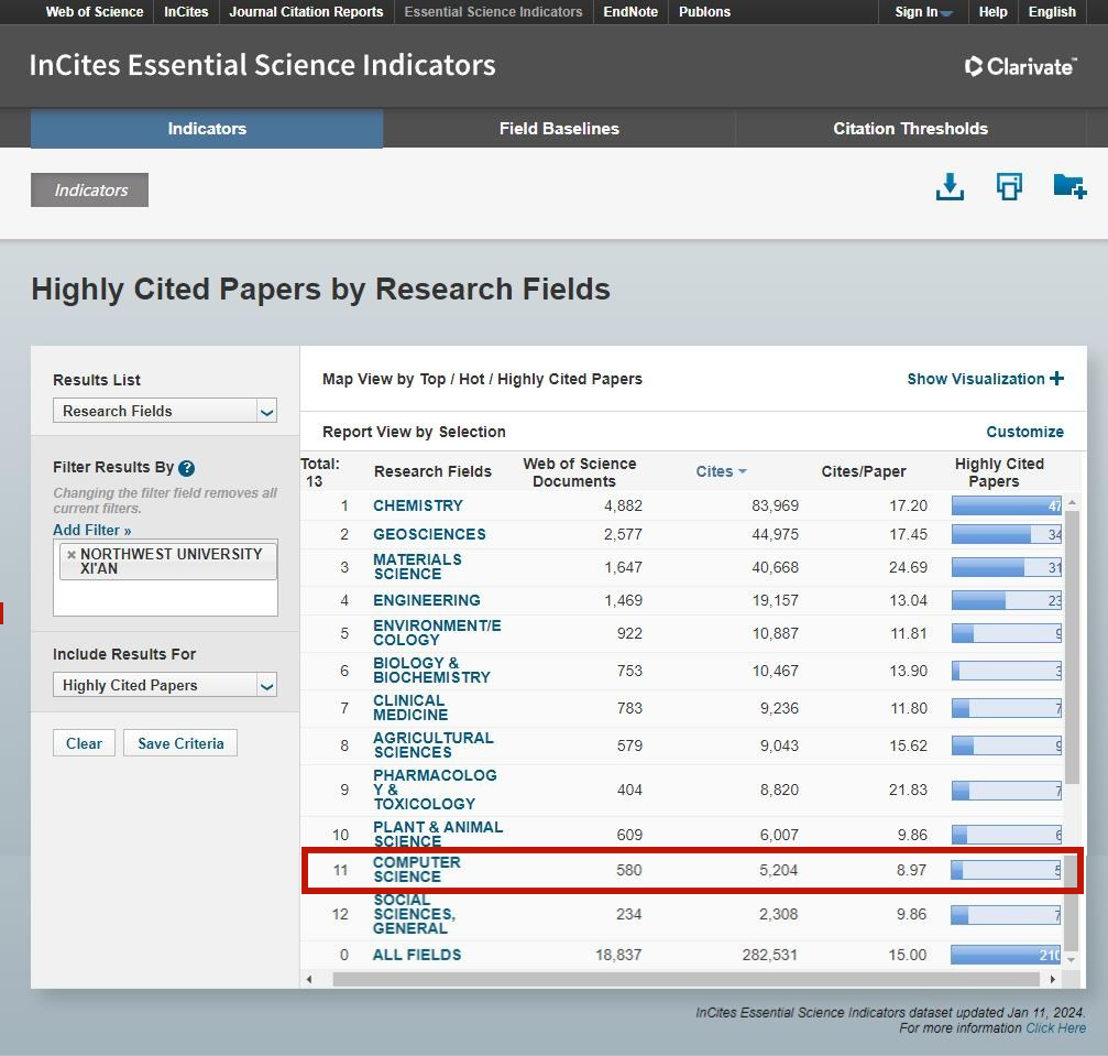 日前,科睿唯安(Clarivate Analytics)更新2024年1月基本科学指标数据库(Essential Science Indicators)最新数据。beat365官网计算机科学首次进入全球前1%行列,这是beat365官网第十四次党代会后,在提升学科声誉方面取得的显著进展。目前,学校全球前1%学科数增至12个,包括地球科学、化学、材料科学、工程学、临床医学、药理学与毒理学、农业科学、植物与动物科学、环境/生态学、生物与生物化学、社会科学总论、计算机科学。入选学科数并列中国内地高校第46位、在陕高校第3位。