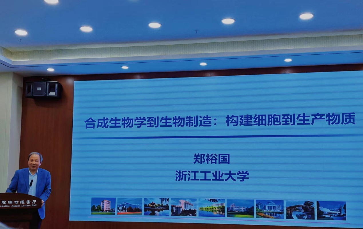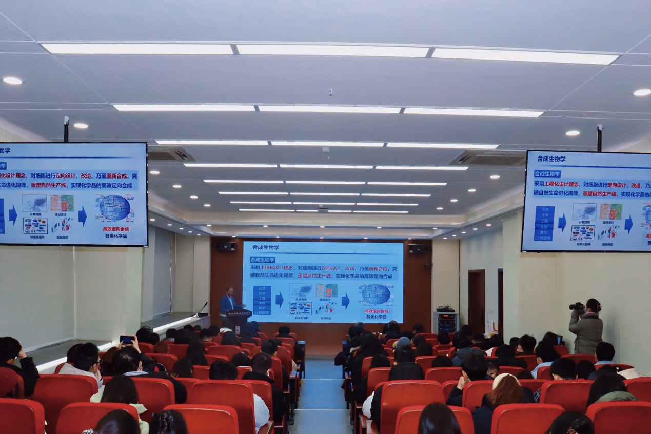 12月17日下午,中国工程院院士、浙江工业大学郑裕国教授做客beat365官网“杨钟健学术讲座”,为师生作了题为“合成生物学到生物制造:构建细胞到生产物质”的报告。校党委常委、副校长陈富林代表学校致欢迎词,并向郑裕国院士赠送了“杨钟健学术讲座”纪念牌。报告会由化工学院负责人主持,学校师生代表听取了报告。