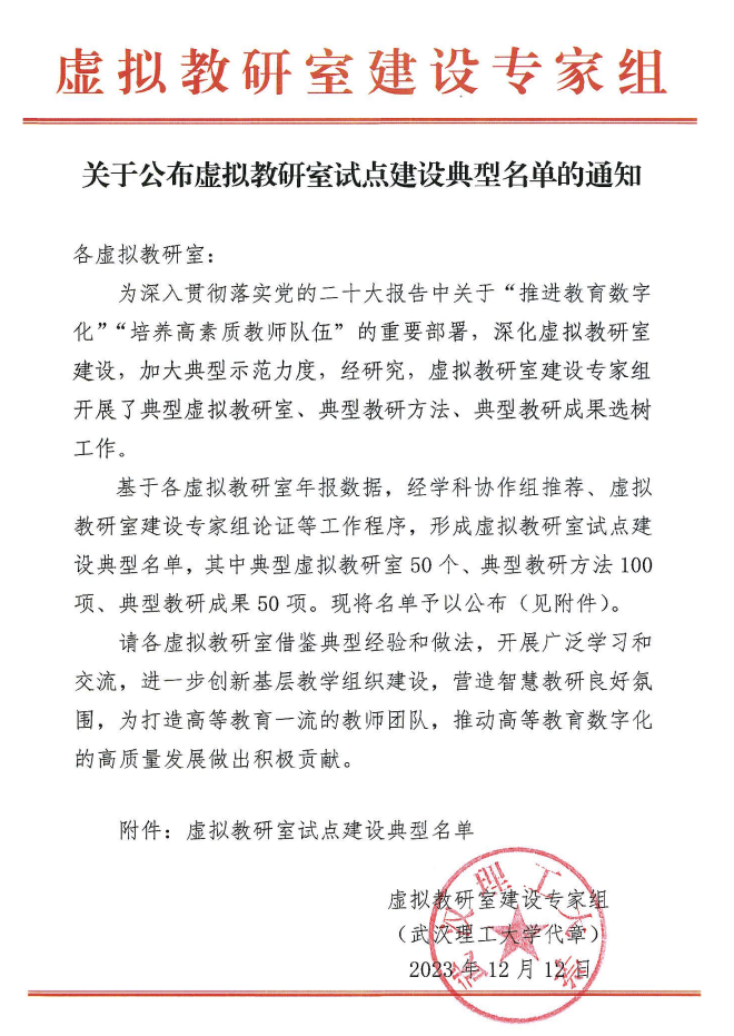 日前,虚拟教研室建设专家组公布了虚拟教研室试点建设典型名单,beat365官网党委常委、副校长赖绍聪教授负责的“‘互联网+’与‘智能+’融合探索拔尖人才培养改革创新”案例入选典型教研方法。这一成绩是对地质学拔尖学生培养模式研究虚拟教研室创新基层教学组织建设、营造智慧教研良好氛围、促进人才培养质量提升的肯定。