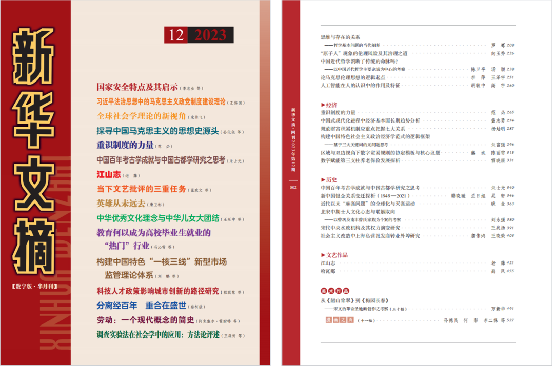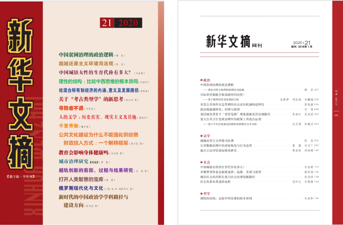 《新华文摘》是由国家新闻出版广电总局主管、人民出版社主办的大型理论性、综合性、资料性文摘类权威期刊,人大复印报刊资料的转载量(率),则被学术界和期刊界视为人文社科领域中客观公正、影响广泛的学术评价标准之一,其转载文章代表了社科研究成果的前沿。