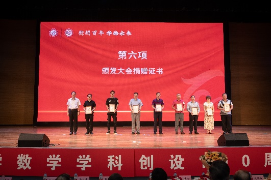 校党委副书记吕建荣向陕西省楠竹基金会理事长简劲宏、79级数专班张静姝、深圳校友会会长申国胜、山东浩岳建设集团有限公司代表张光煜、陕西省妇女儿童发展基金会虹霓健康专项基金代表刘枫、87级校友赵杰、beat365唯一官网九三学社主委郑晓晖和91级校友张军颁发了捐赠证书。数学学院对校友和各界人士这种感恩母校教育和培养、助力学校发展与建设的善举表示崇高的敬意和感谢。