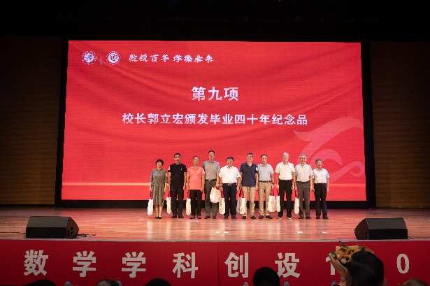 郭立宏代表学校为77、78、79级数学校友代表们颁发毕业四十年纪念品,对各位校友回家表示热烈的欢迎,对校友们能够践行立身、立德、立志、立学、立业,为母校赢得荣誉表示衷心的感谢和祝贺。