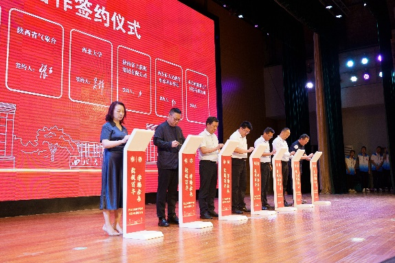 大会上,学校与陕西省大数据集团有限公司、陕西省气象台、上海汇纳科技有限公司、西安翔腾微电子科技有限公司和西安市人民政府驻深圳办事处签约。校党委常委、副校长吴振磊,数学学院负责人共同与合作单位代表签约。