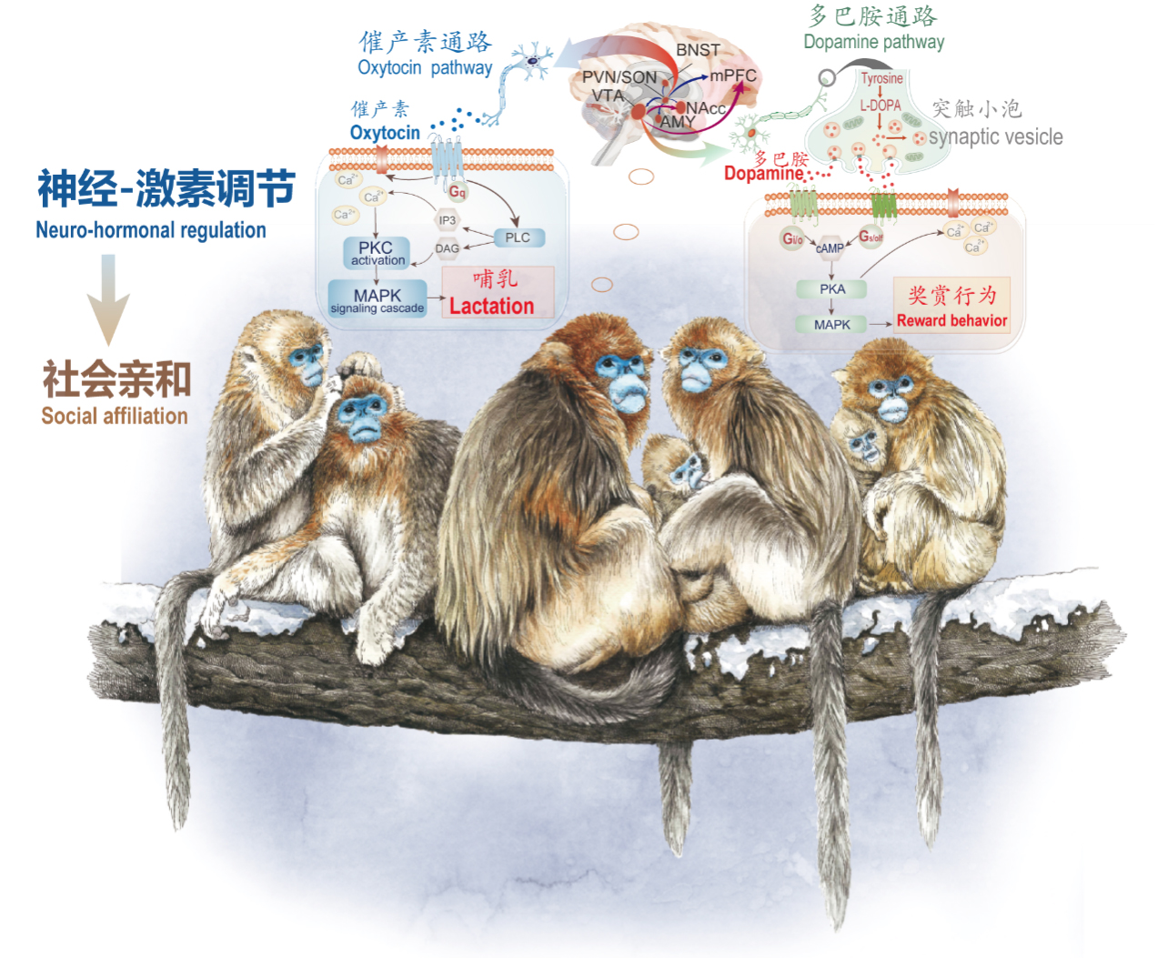 同时,该成果开创了“行为-生态-基因组”这一全新的研究范式。“我们组装了亚洲叶猴七个属代表物种的高质量基因组,并将宏观进化生物学与微观分子生物学的中心法则相结合,来挖掘寒冷事件驱动社群聚集背后的遗传学机制”齐晓光说。研究表明,历史上的寒冷事件促进了亚洲叶猴的能量代谢和神经、激素调节相关基因受到正选择,演化出了更加有效脑、神经激素调控网络,其中在奇鼻猴类群中与催产素、多巴胺递质系统有关的基因改变格外引人注目。“在哺乳动物中,催产素和多巴胺具有强化母亲与幼儿之间的纽带的作用。寒冷效应引发它们的适应性变化,强化了母婴间的纽带,延长了寒冷地区奇鼻猴的亲本抚育。同时,个体间的友好行为也得到促进,进而推动了单家庭群向重层社会的聚集。”