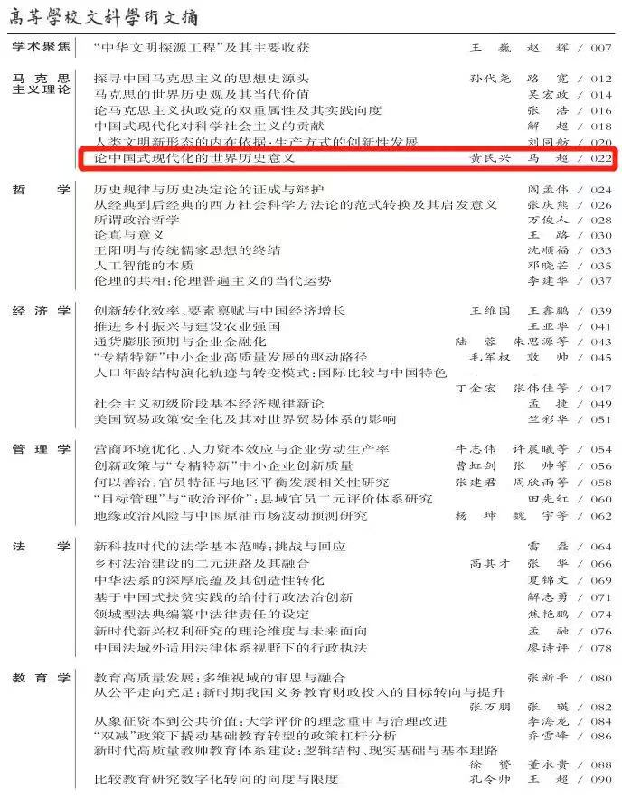 除了上述两篇论文外,黄民兴教授的《论中国式现代化的世界历史意义》(《beat365唯一官网学报》(哲学社会科学版)2023年第1期),从世界历史进程的角度阐释了中国式现代化对于世界现代化进程的重要意义和借鉴价值。该文被《高等学校文科学术文摘》2023年第2期全文转载。