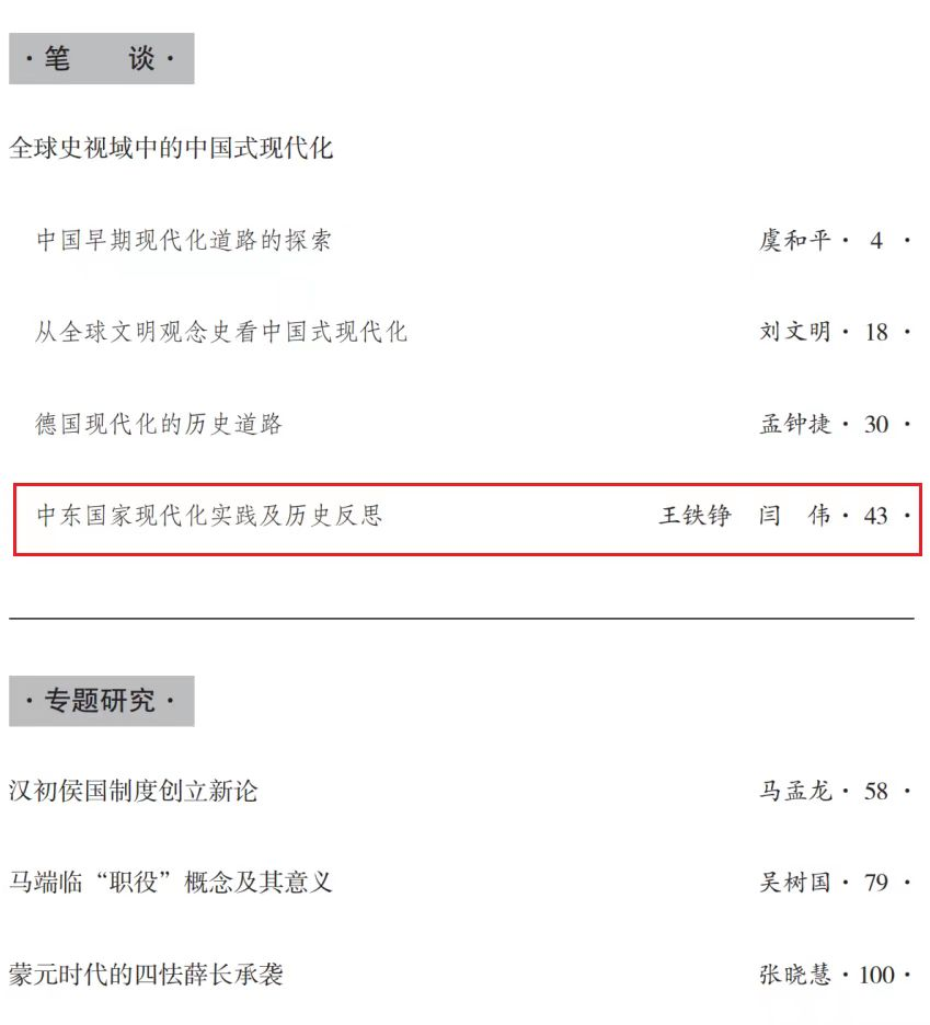 中东研究所王铁铮教授、闫伟教授的论文《中东国家现代化实践及历史反思》在《历史研究》2023年第2期发表。本文全面研究了中东国家的现代化历程,对现代化道路的探索,以及现代化的成败得失。