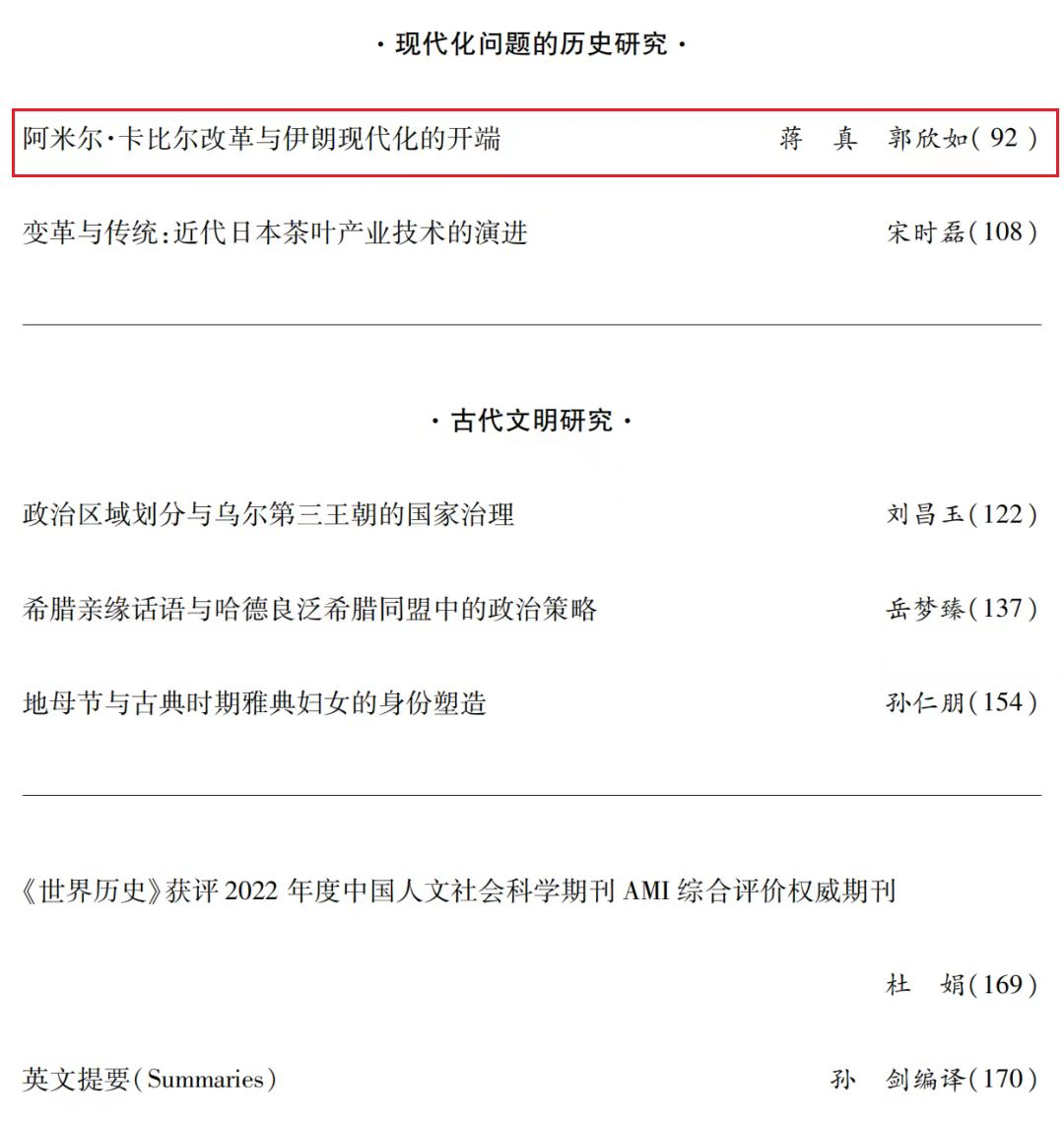 中东研究所蒋真教授和博士生郭欣如的论文《阿米尔·卡比尔改革与伊朗现代化的开端》在《世界历史》2023年第2期发表。论文指出,阿米尔·卡比尔改革是伊朗近代历史上首次全面铺开的现代化改革,这场改革既植根于伊朗传统政治文化又汲取了欧洲国家有益成分,为近代伊朗开创了一种传统—现代混合型现代化改革实践的新模式。阿米尔·卡比尔改革系伊朗早期现代化的开端,不仅巩固了恺加王朝的统治秩序,实现了波斯数千年的传统在恺加时代的传承与创新,也率先推动了伊朗传统社会向现代化转型,为伊朗国家现代化进程提供了宝贵的历史经验。