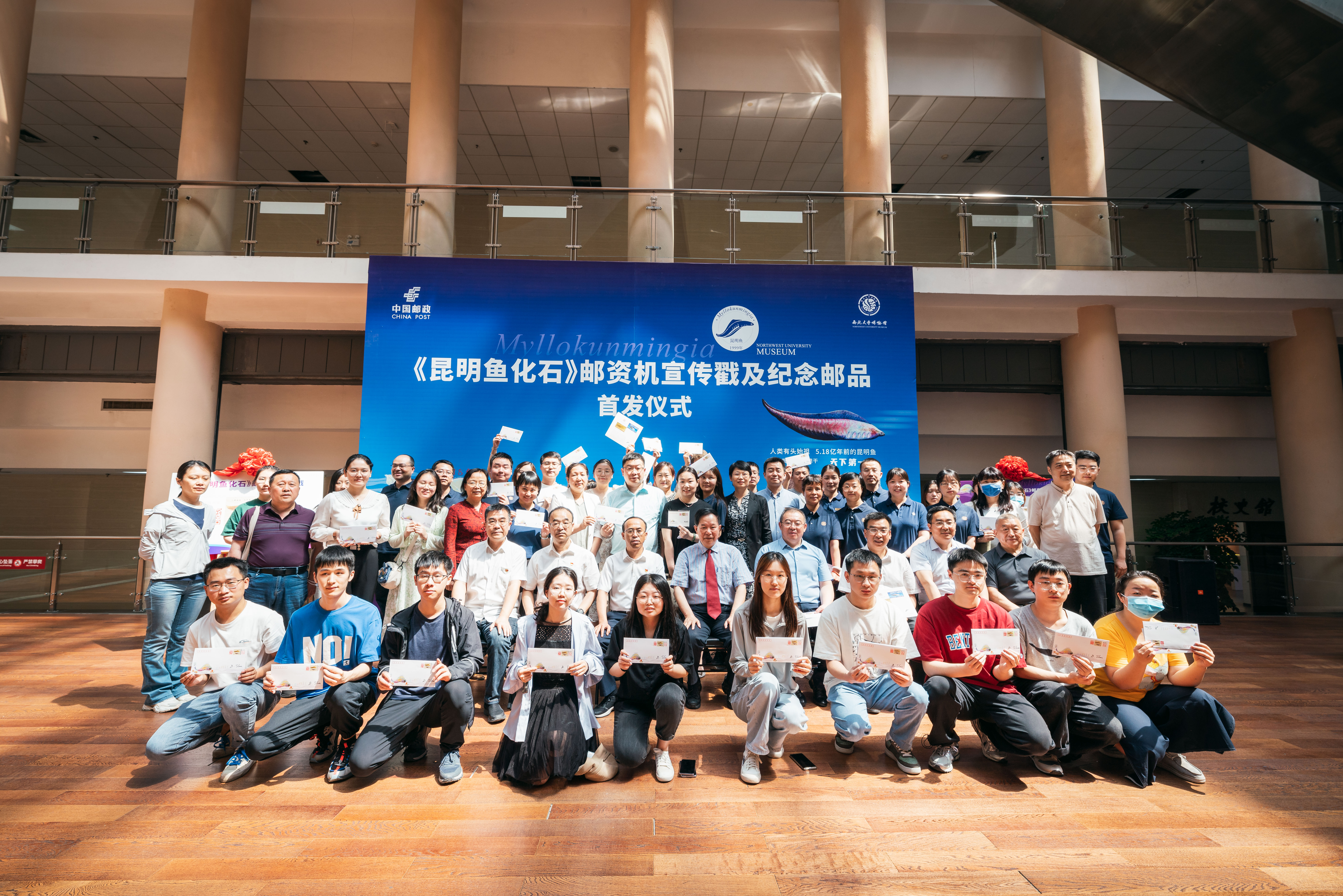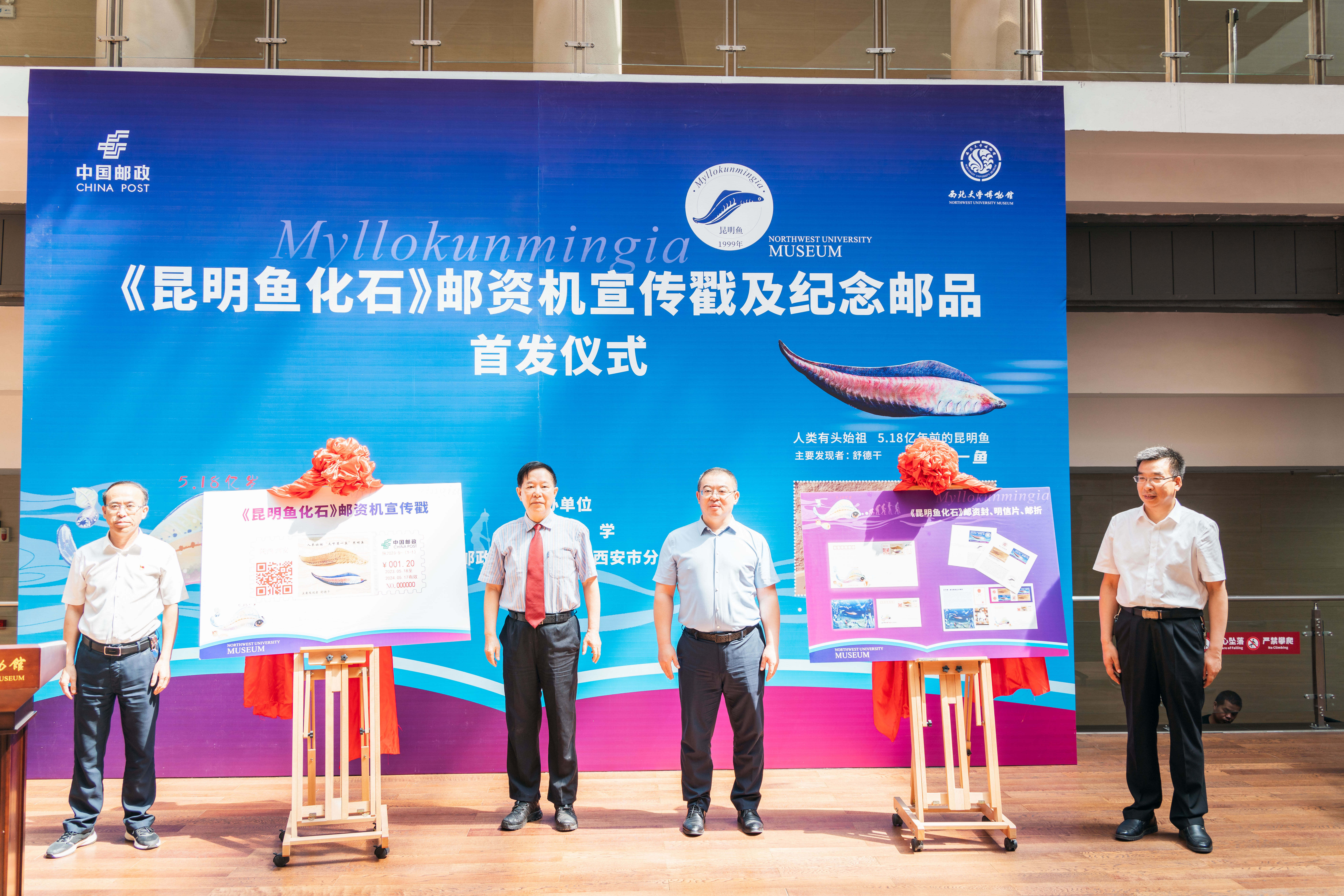 5月18日上午,《昆明鱼化石》邮资机宣传戳及系列纪念邮品在beat365官网博物馆首发。“昆明鱼”化石的发现者、中国科学院院士、beat365官网博物馆馆长舒德干,校党委常委、副校长常江,校党委常委、宣传部部长田明纲,中国邮政集团有限公司西安市分公司副总经理李卫国共同为《昆明鱼化石》邮资机宣传戳及纪念邮品揭幕。