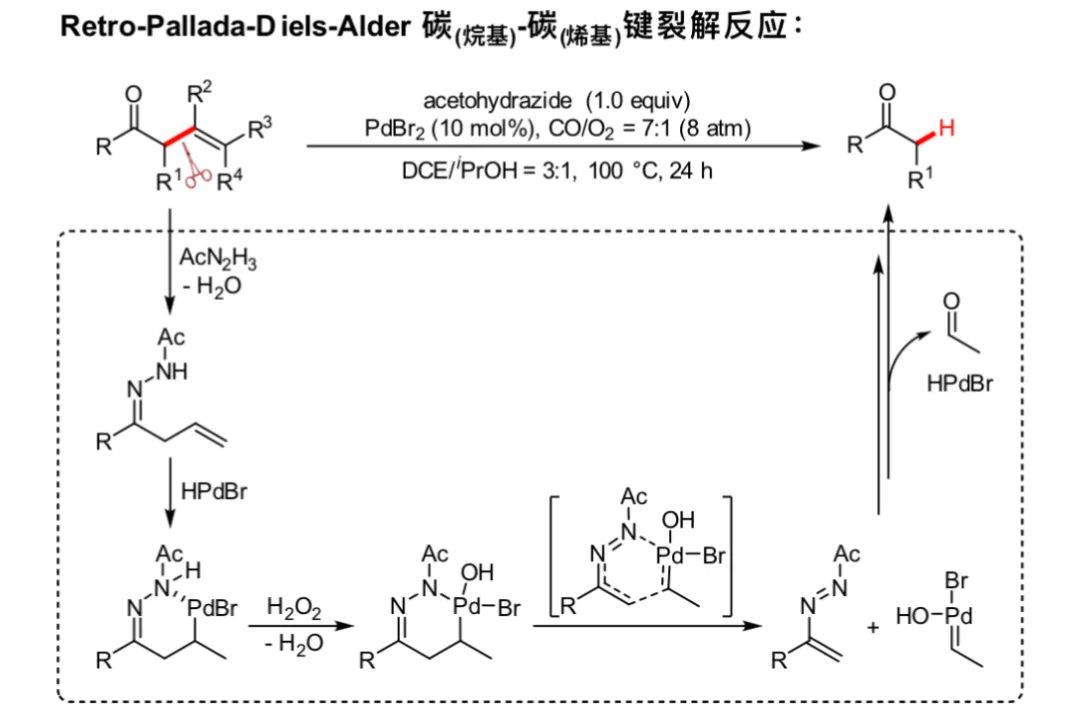 研究团队以β,γ-烯基酮为底物,以酰基肼为环化辅助剂,在钯催化下通过Retro-Pallada-Diels-Alder的反应过程,实现了羰基α位碳(烷基)-碳(烯基)σ键的高选择性裂解。其中四价钯中间体的生成和钯氢催化剂的循环是该反应的关键。