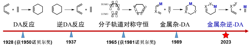 Diels-Alder(DA)反应及其逆反应(Retro-Diels-Alder)是重要和基础的碳碳键生成与裂解方法,对其研究伴随着现代化学的发展而不断深入:1928年Diels和Alder报道了之后以他们名字命名的Diels-Alder反应(获1950年诺贝尔化学奖),随后Woodward和Hoffmann等人以此为基础发展了可以解释反应性和选择性的Woodward–Hoffmann规则(获1981年诺贝尔化学奖),上世纪八九十年代出现的金属杂Diels-Alder反应更是拓展了传统研究的范围。