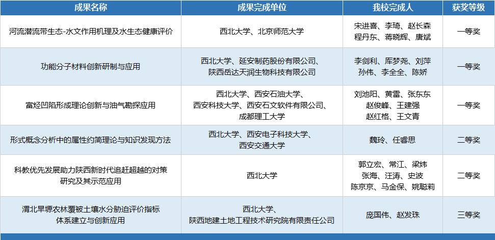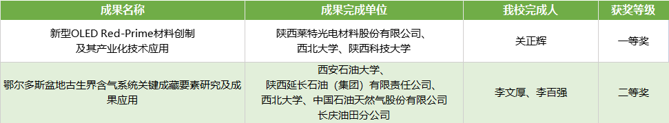 由宋进喜教授等主持完成的《河流潜流带生态-水文作用机理及水生态健康评价》、李剑利教授等主持完成的《功能分子材料创新研制与应用》、刘池阳教授等主持完成的《富烃凹陷形成理论创新与油气勘探应用》获一等奖;魏玲教授等主持完成的《形式概念分析中的属性约简理论与知识发现方法》、郭立宏教授等主持完成的《科教优先发展助力陕西新时代追赶超越的对策研究及其示范应用》获二等奖;庞国伟教授等主持完成的《渭北旱塬农林覆被土壤水分胁迫评价指标体系建立与创新应用》获三等奖。由关正辉教授等参与完成的《新型OLED Red-Prime材料创制及其产业化技术应用》获一等奖;李文厚教授等参与完成的《鄂尔多斯盆地古生界含气系统关键成藏要素研究及成果应用》获二等奖。