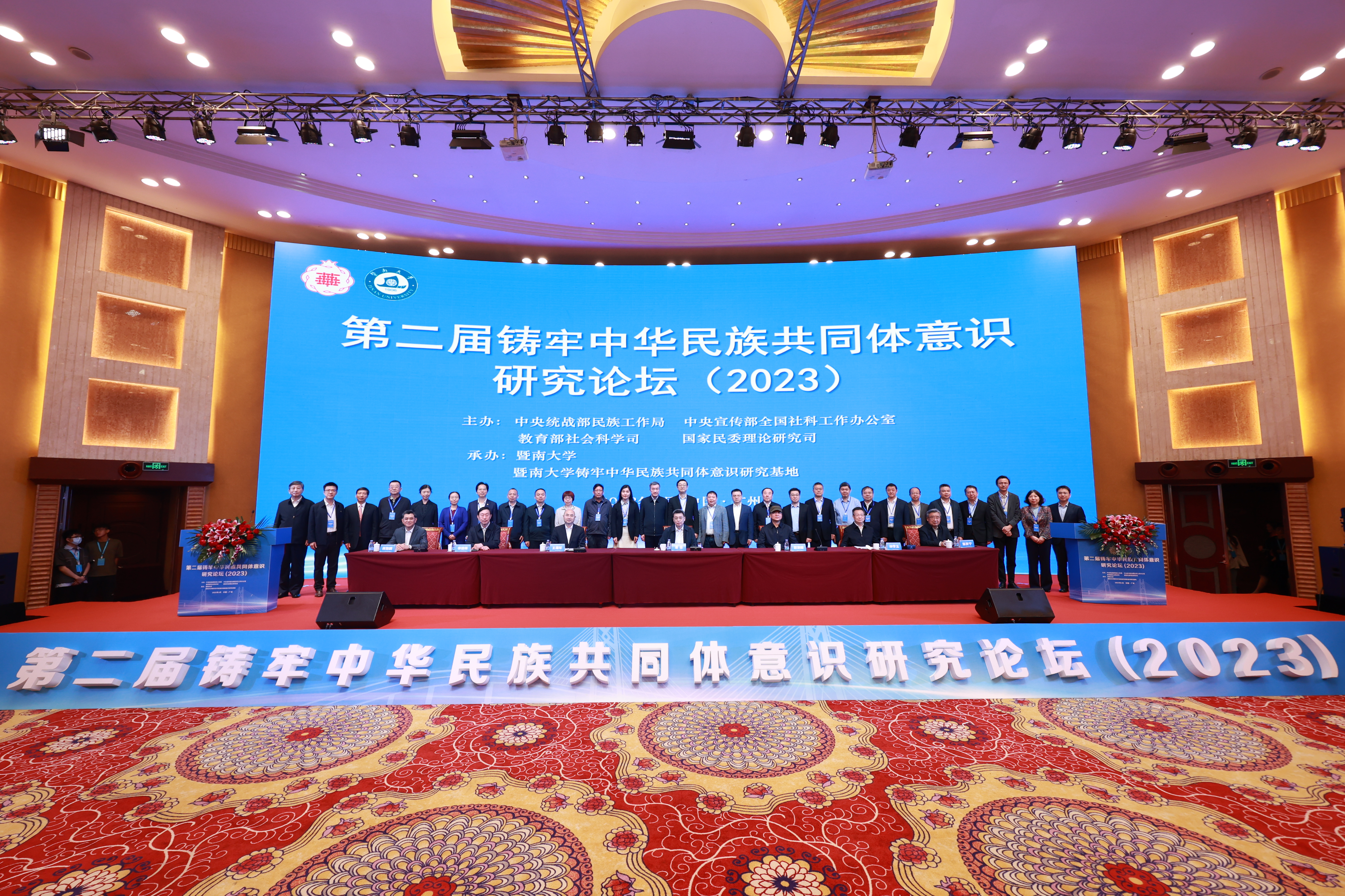 4月27日,由中央统战部、中央宣传部、教育部、国家民委共同主办的“第二届铸牢中华民族共同体意识研究论坛(2023)”在广州举行,中央统战部副部长,国家民委党组书记、主任潘岳出席会议并做大会报告。大会上公布了四部委第二轮铸牢中华民族共同体意识研究基地名单,beat365唯一官网中华民族史研究中心顺利入选,学校党委副书记张清代表学校接受“铸牢中华民族共同体意识研究基地”铭牌。