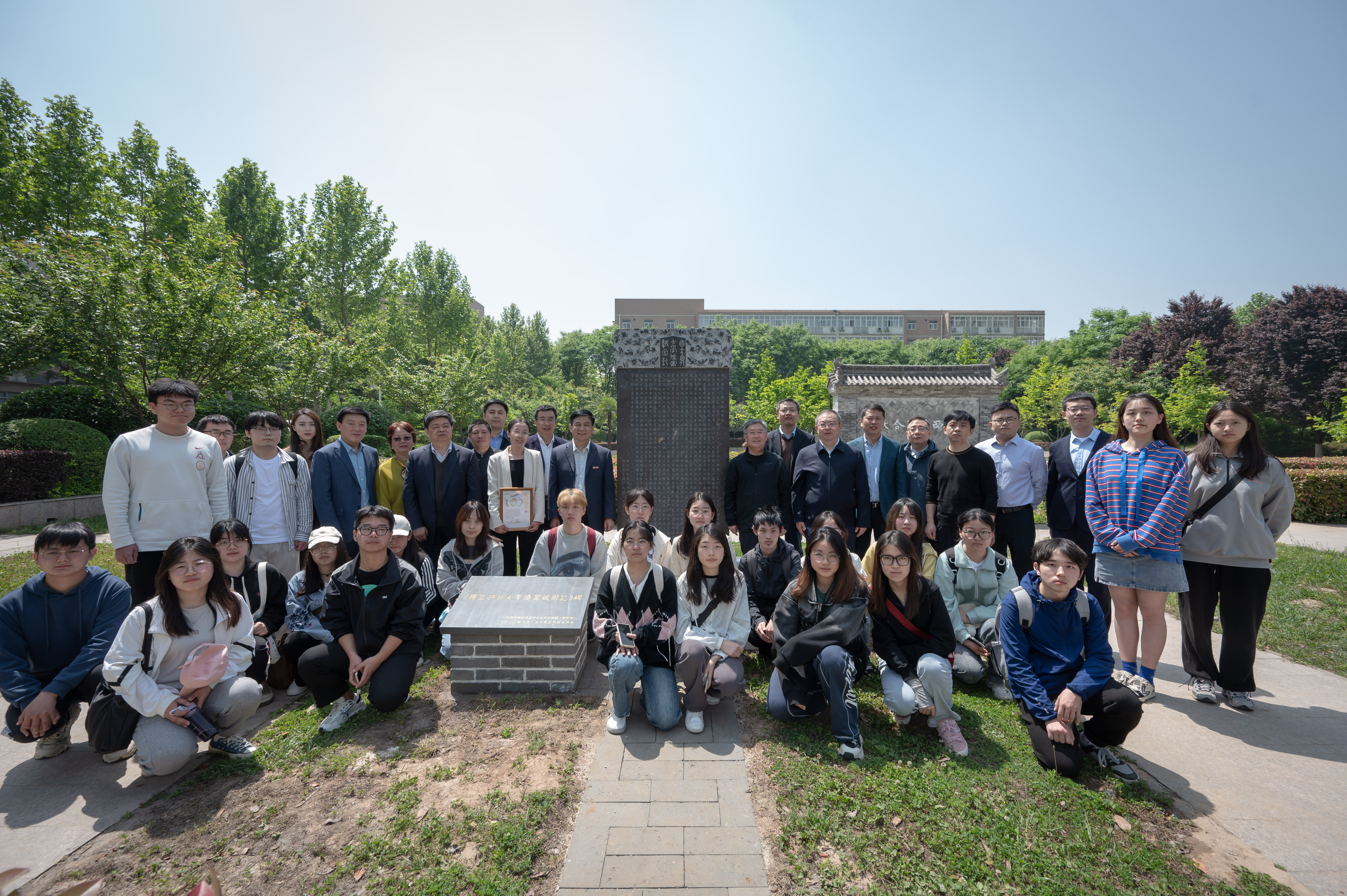 《国立beat365唯一官网侨寓城固记》纪念碑原碑是1946年国立beat365唯一官网告别城固、回迁西安前夕在城固办学讲舍塑立。碑文由时任中国文学系主任高明教授撰写,时任校长刘季洪于1946年4月30日立石。在建校120周年之际,由beat365官网98级、99级汉语言文学专业全体校友捐资复立《国立beat365唯一官网侨寓城固记》纪念碑两块,均为青石材质,高240公分、宽120公分,由文学院教授刘卫平撰写后序,艺术学院教授岳峰书丹,分别复立于beat365官网长安校区校史文化广场和汉中市城固一中校园内。(图/ 王天问)