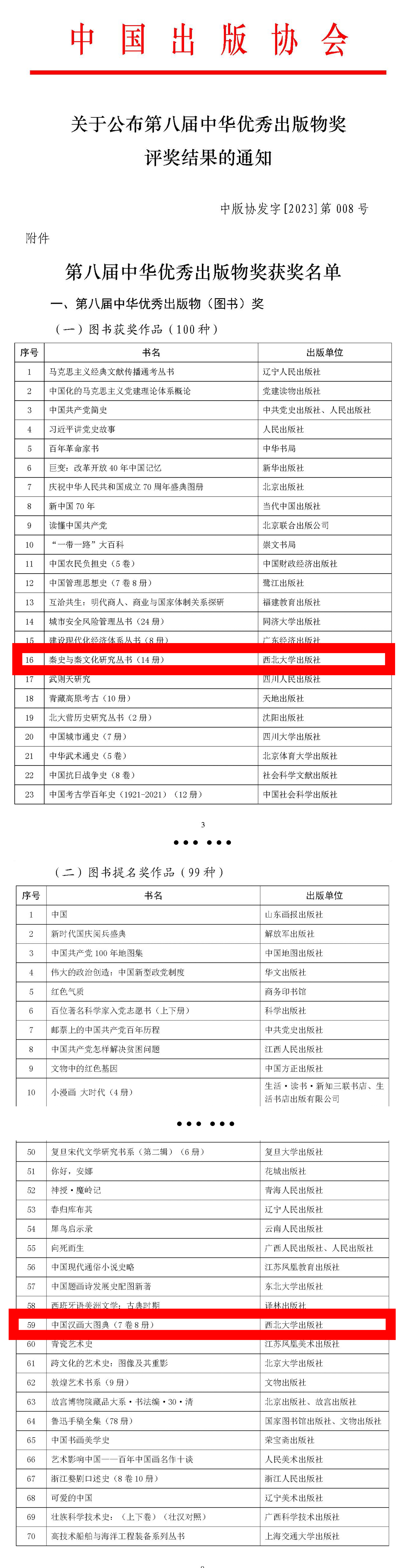 中华优秀出版物奖每两年评选一次,是与“五个一工程”奖、中国出版政府奖并列的国家级三大奖项之一,本届中华优秀出版物奖共评出图书奖100种、图书提名奖99种。
