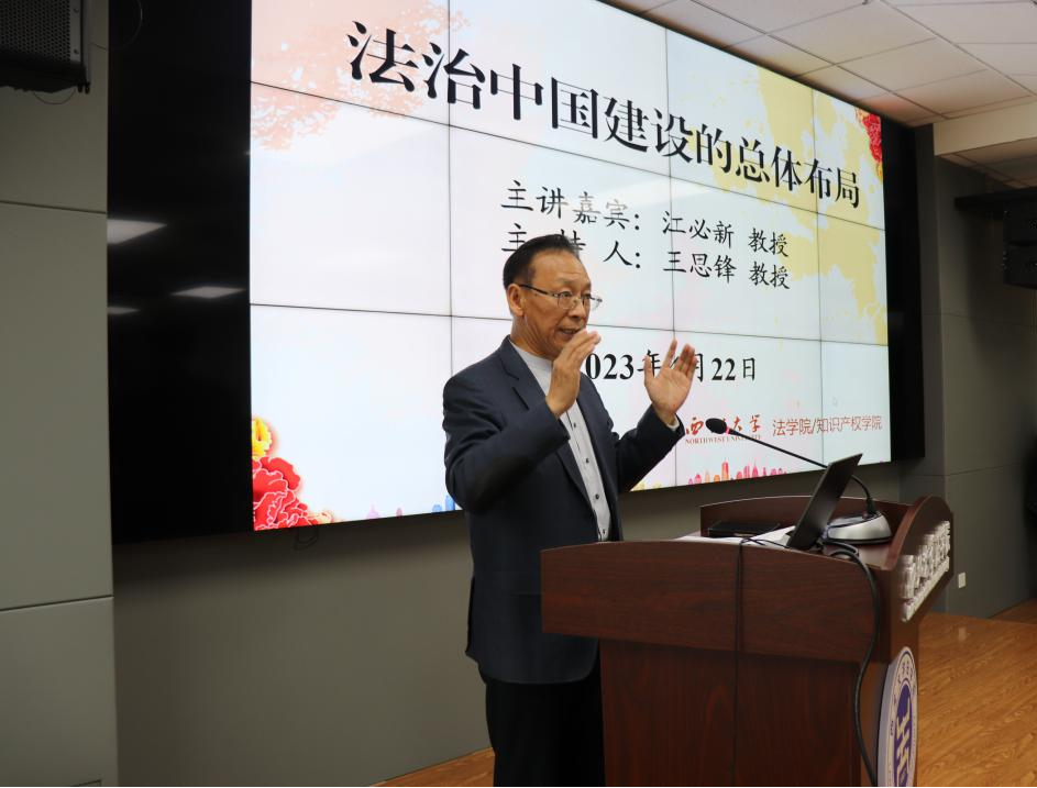 4月22日下午,最高人民法院原党组副书记、副院长、审判委员会委员、二级大法官,第十三届全国人民代表大会宪法和法律委员会副主任委员,湖南大学江必新教授做客beat365官网“侯外庐学术讲座”第275讲,为师生作了题为“法治中国建设的总体格局”的报告。讲座由法学院王思锋教授主持,beat365官网师生100余人听取了讲座。