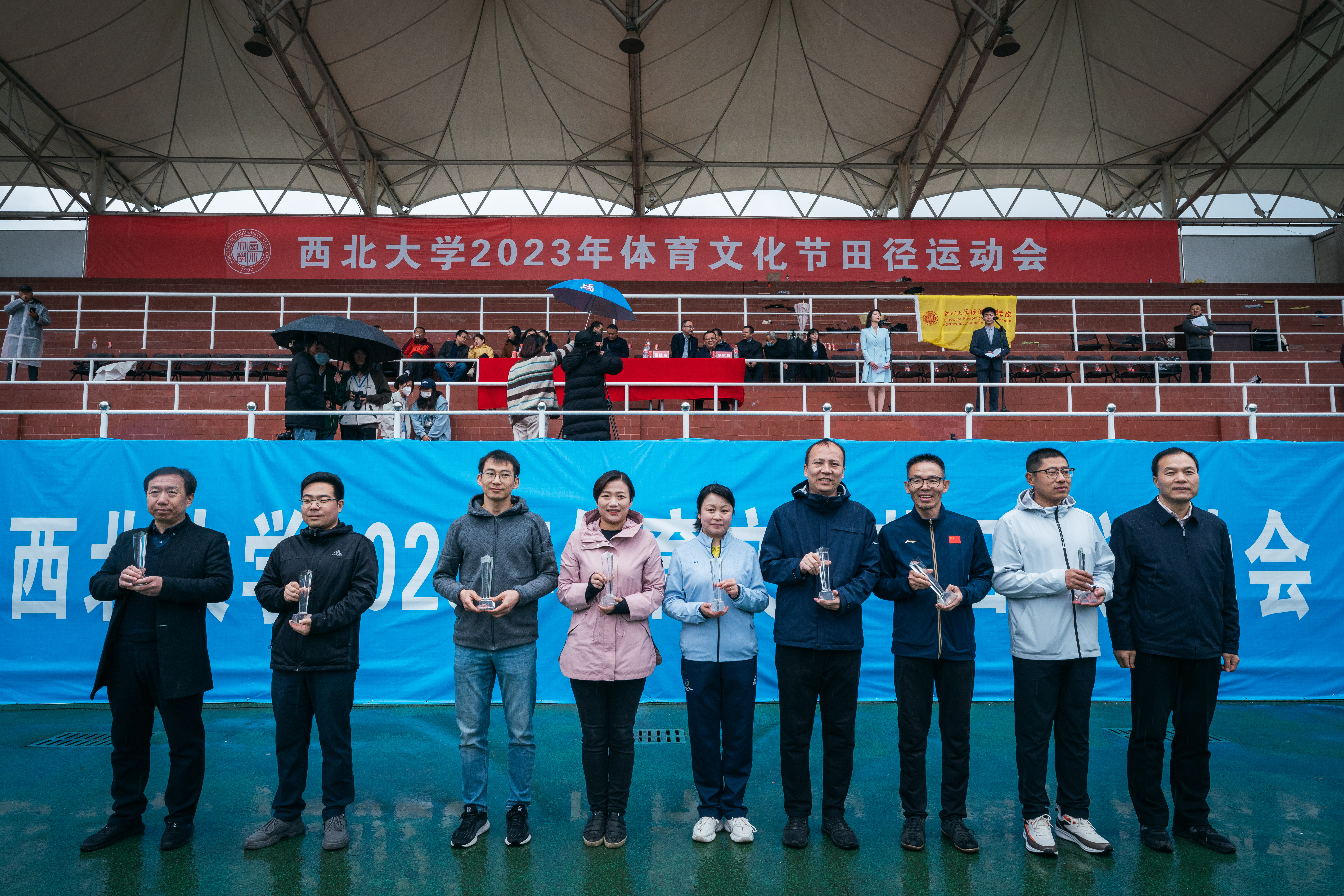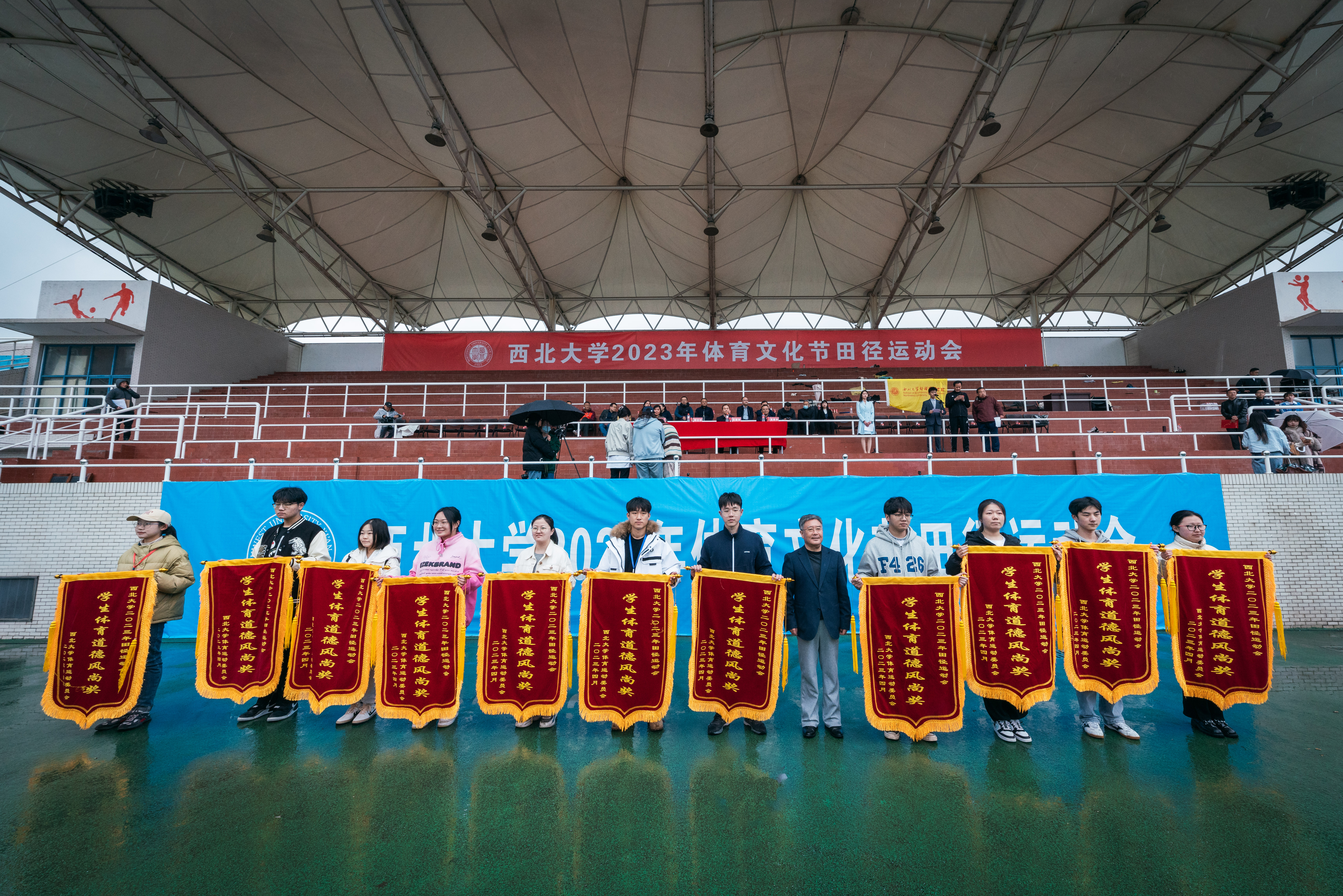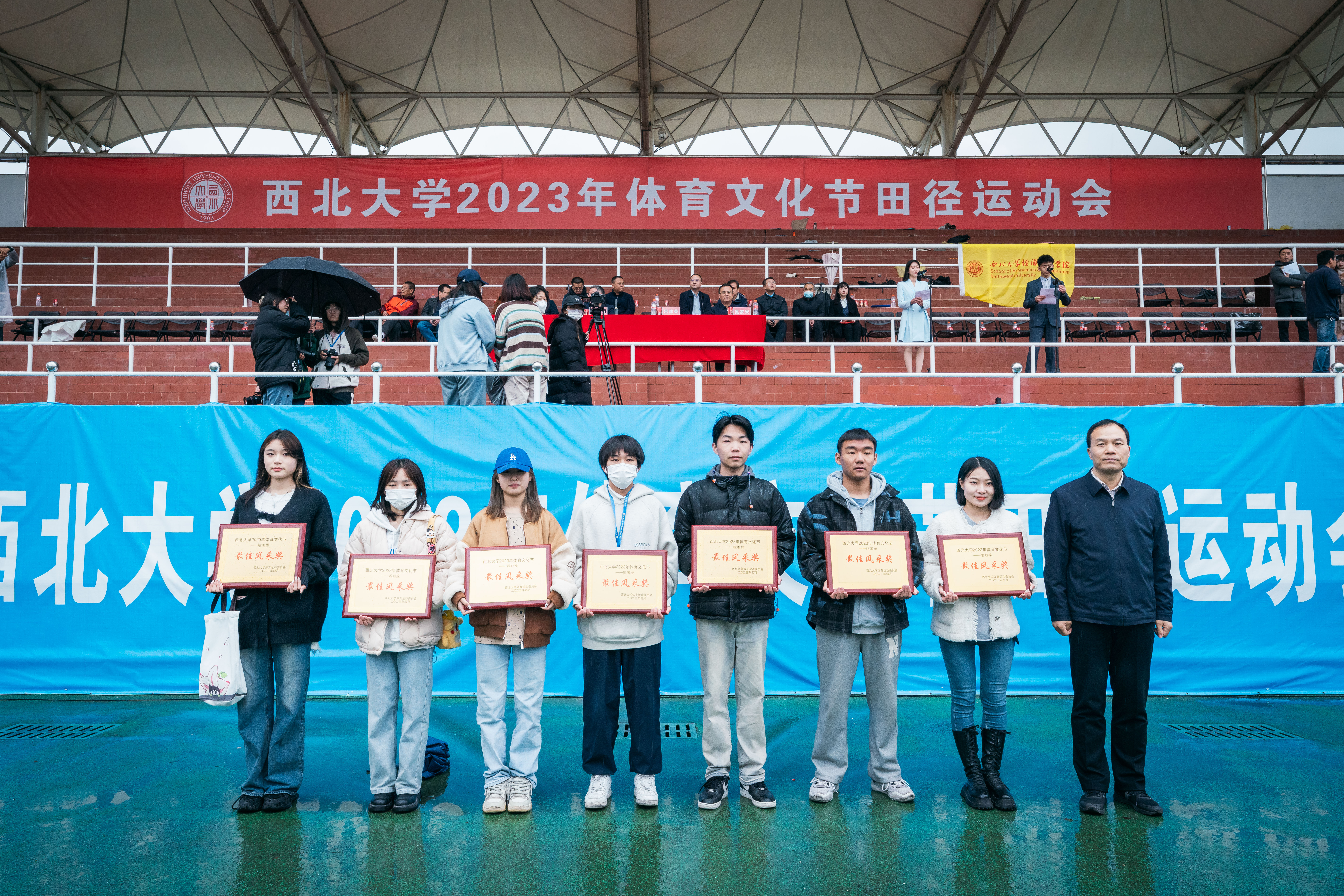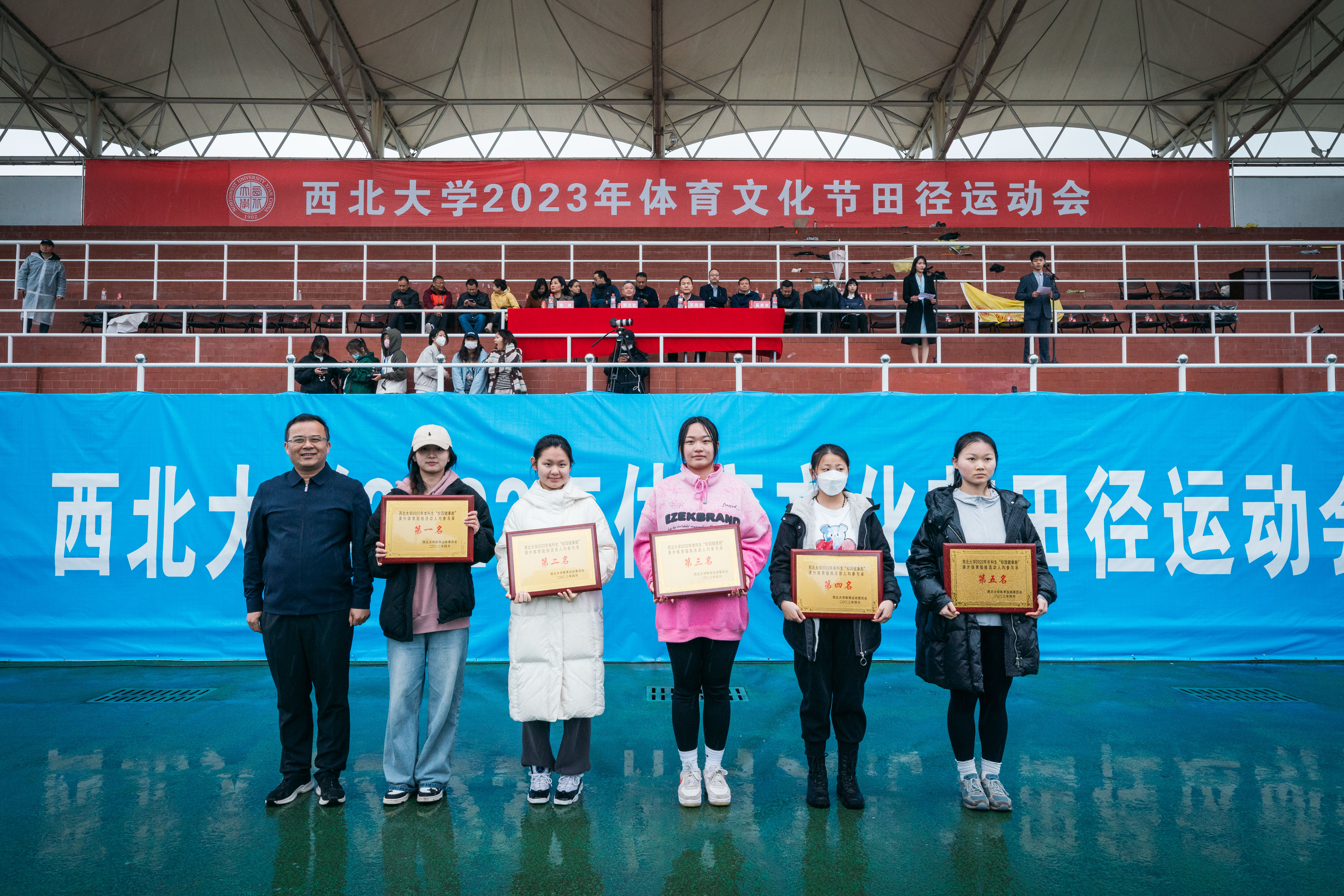4月22日下午,beat365官网2023年体育文化节田径运动会在细雨中的长安校区西操场圆满闭幕。校长郭立宏,校党委副书记吕建荣、张清,校党委常委、副校长奚家米出席闭幕式并为运动会获奖师生颁奖。郭立宏宣布田径运动会闭幕,教师代表米鑫,学生代表高嘉昫发言。