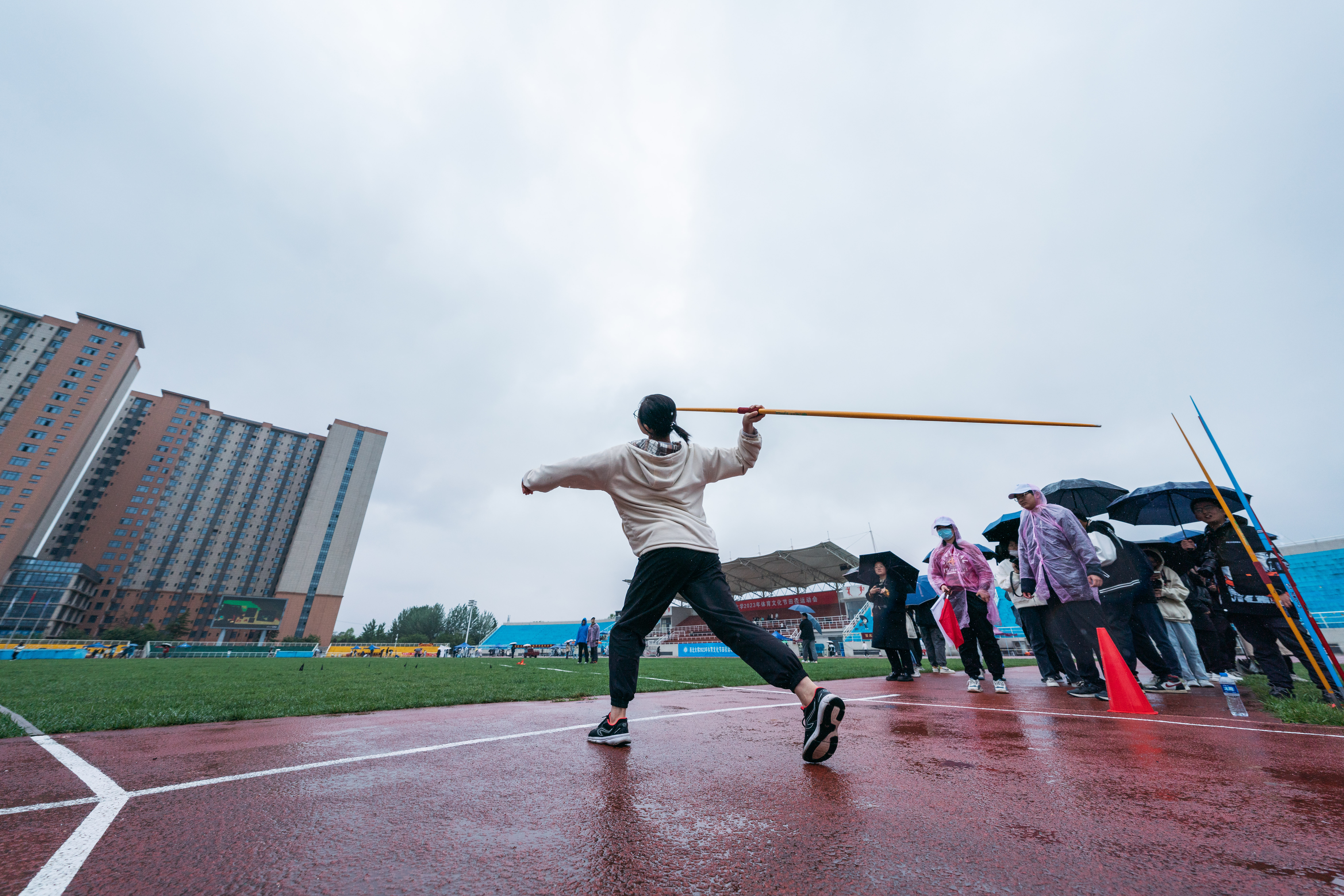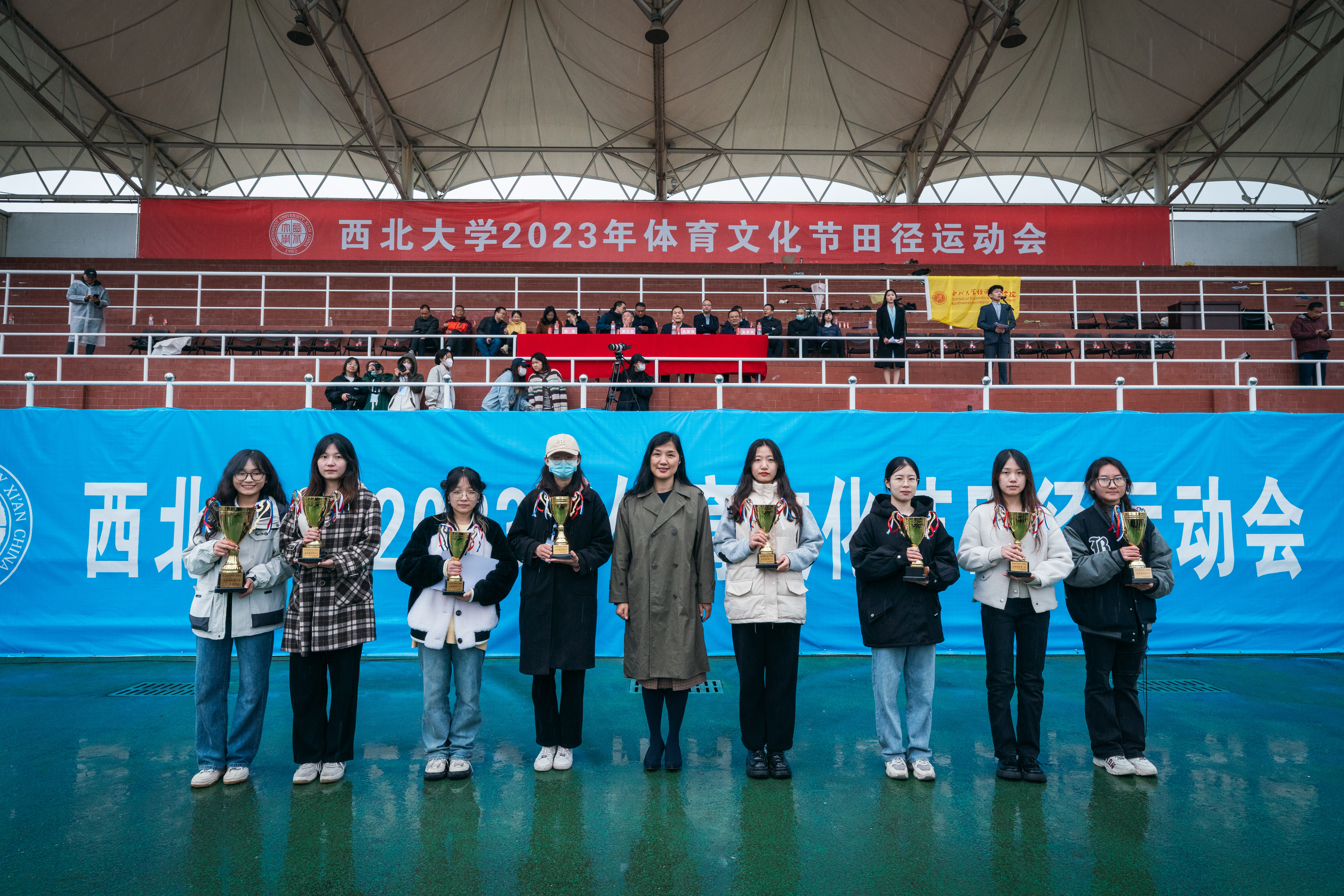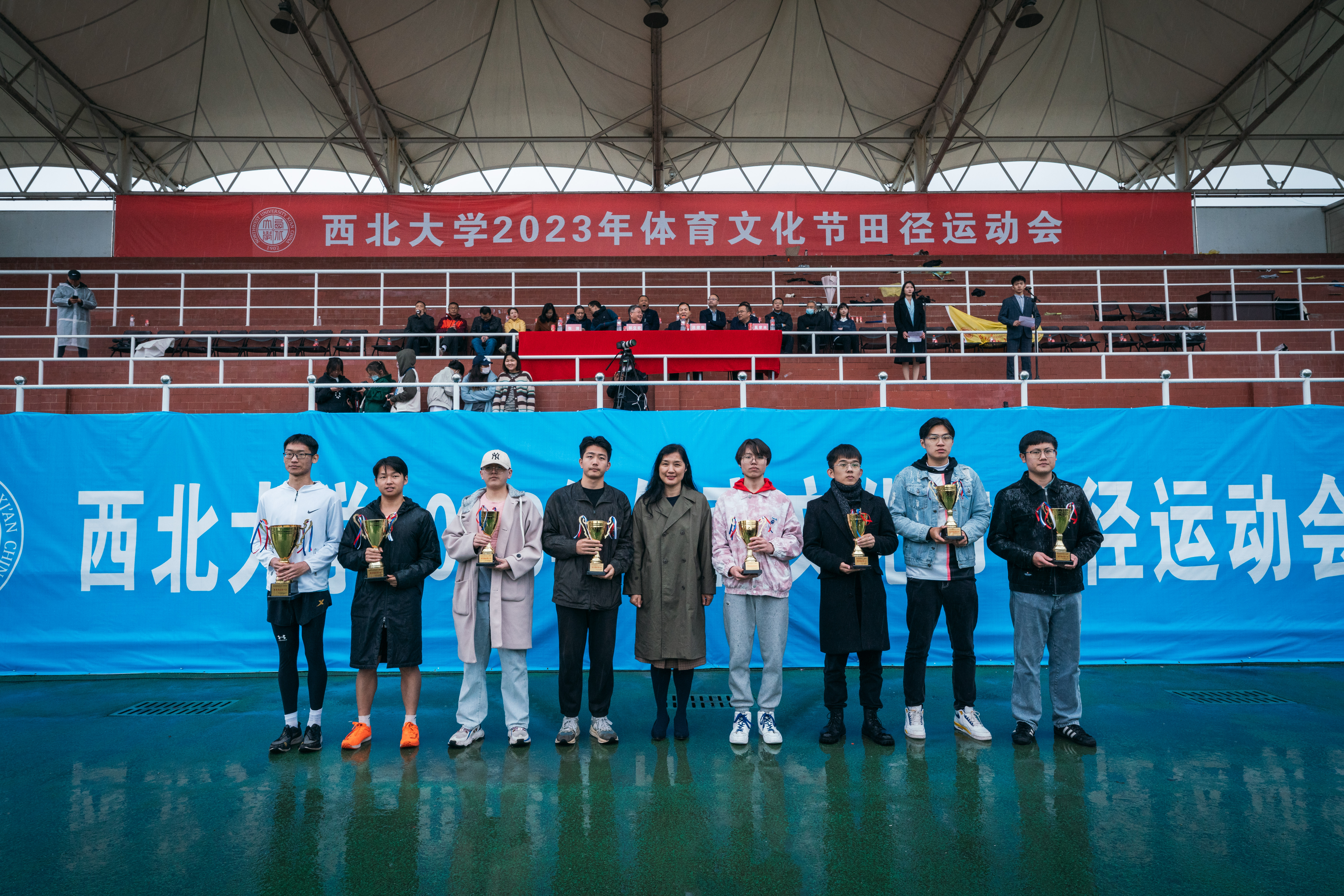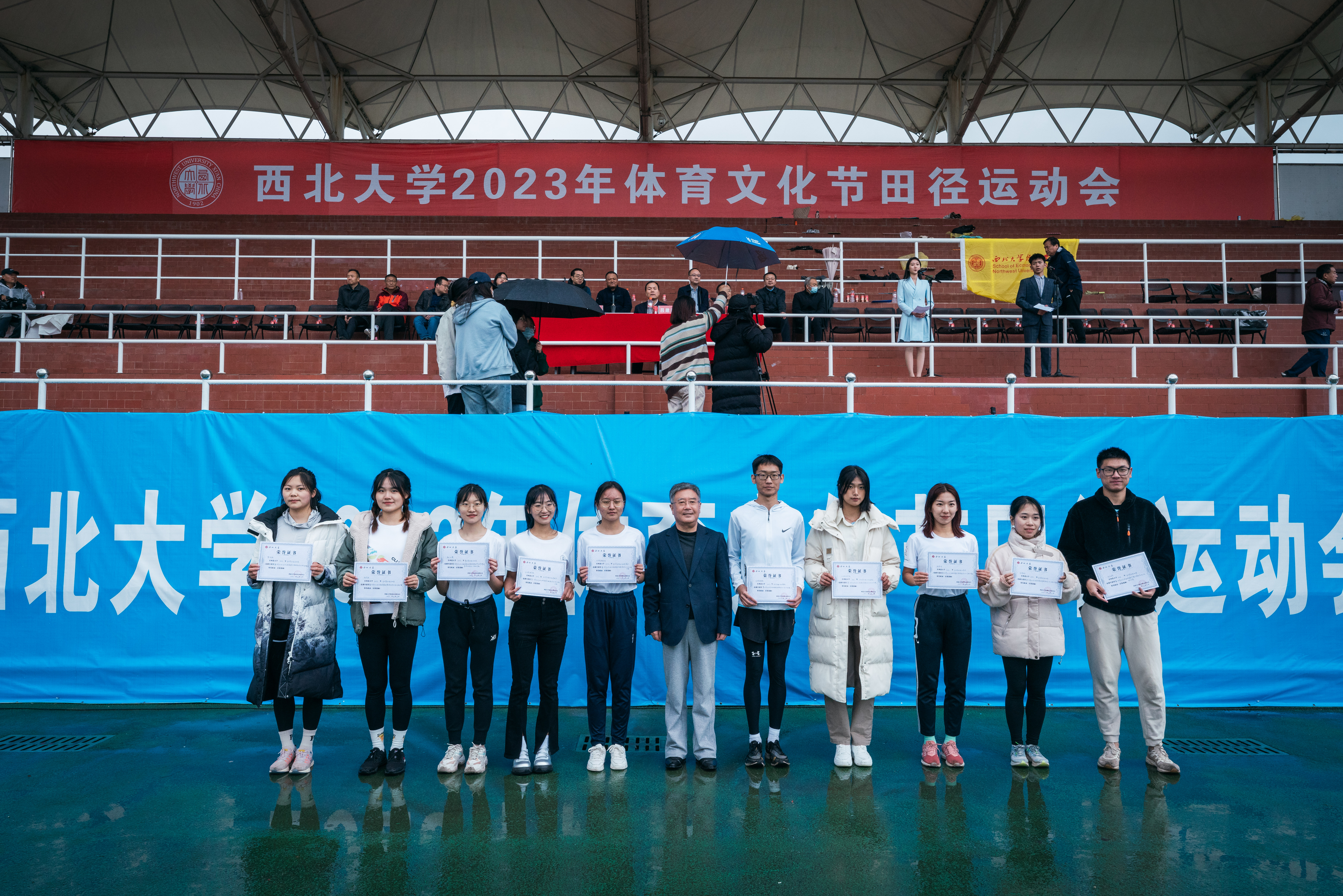 4月22日下午,beat365官网2023年体育文化节田径运动会在细雨中的长安校区西操场圆满闭幕。校长郭立宏,校党委副书记吕建荣、张清,校党委常委、副校长奚家米出席闭幕式并为运动会获奖师生颁奖。郭立宏宣布田径运动会闭幕,教师代表米鑫,学生代表高嘉昫发言。
