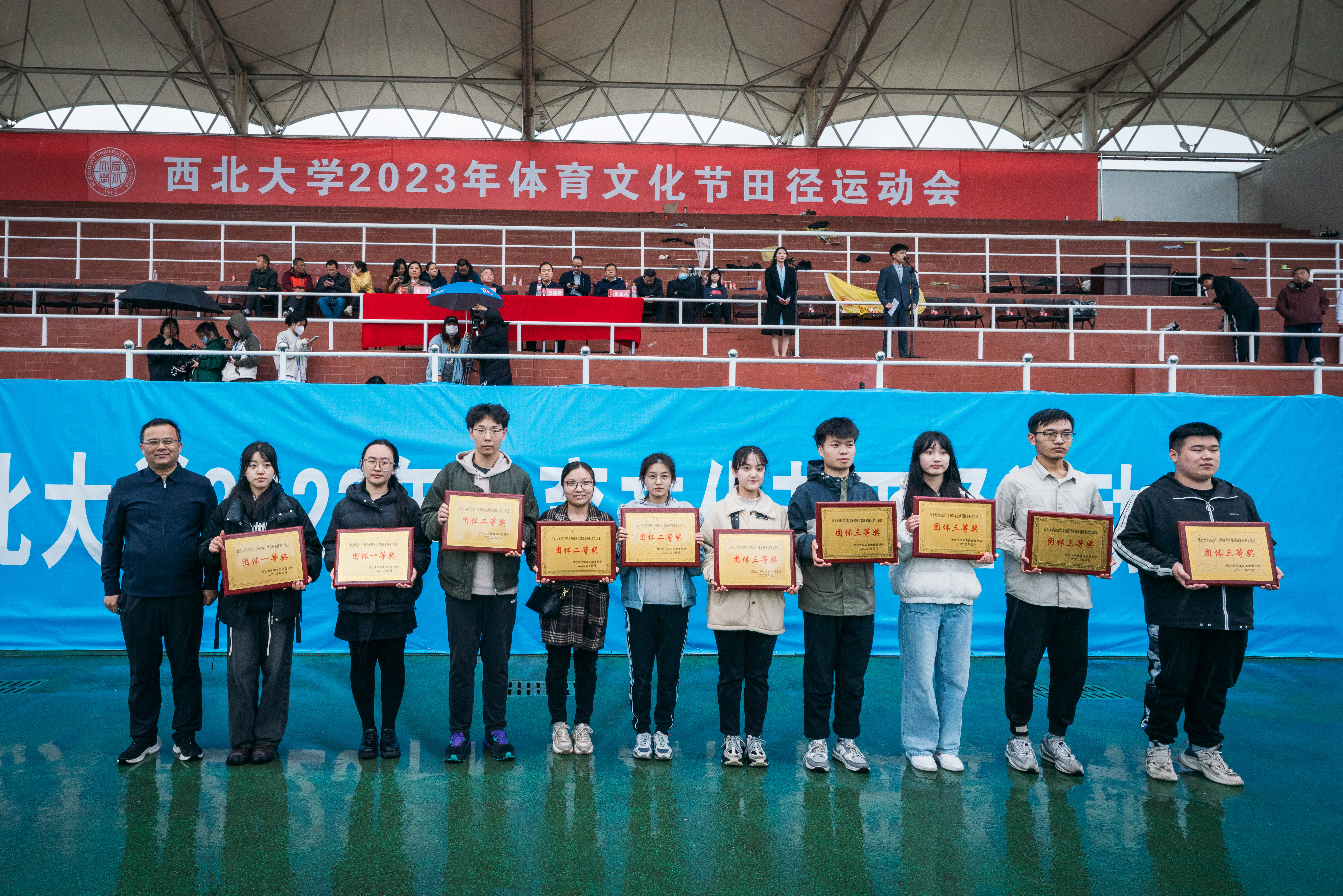 与会领导为获奖单位、破纪录运动员、2022年本科生“校园健康跑”课外体育锻炼活动人均参与率前五名院系及2022年《国家学生体质健康标准》测试优秀团体颁奖。