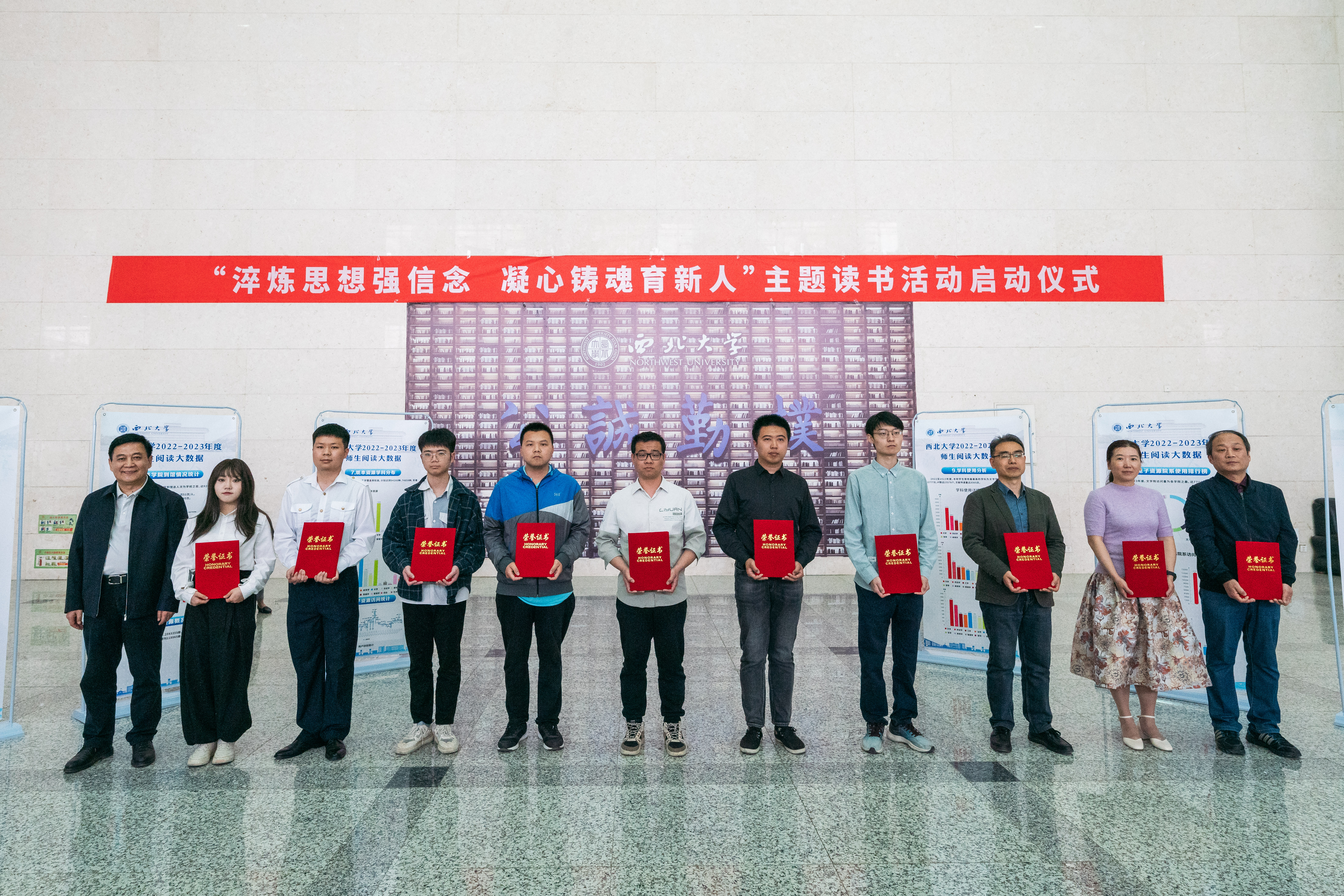 活动中,图书馆负责人发布了2022-2023年度师生阅读大数据。学校根据阅读大数据评选出10名年度师生“阅读之星”,王亚杰为师生“阅读之星”颁发了纪念证书。文学院关峰副教授和艺术学院杜美悦同学分别作为“阅读之星”代表进行了发言。仪式发布了本次主题读书活动的推荐书单,相关单位负责人分别为师生代表赠书。