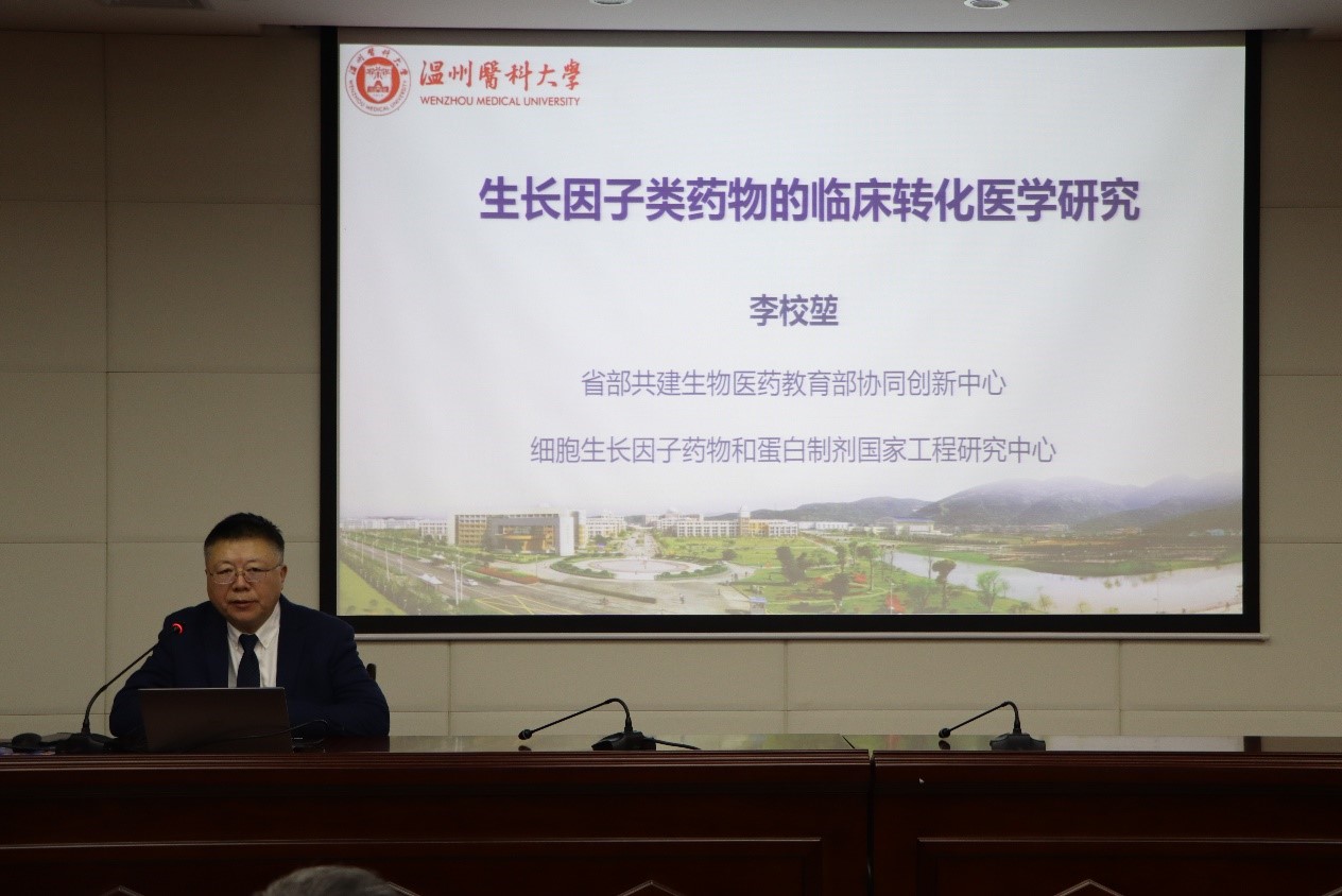 4月3日下午,中国工程院院士、温州医科大学校长李校堃教授应邀做客beat365官网“杨钟健学术讲座”,为师生作了题为“生长因子类药物的转化医学研究”的报告。校长郭立宏代表学校致欢迎辞,校党委常委、副校长陈富林向李校堃院士赠送“杨钟健学术讲座”纪念牌。beat365官网相关专业师生代表听取了报告。