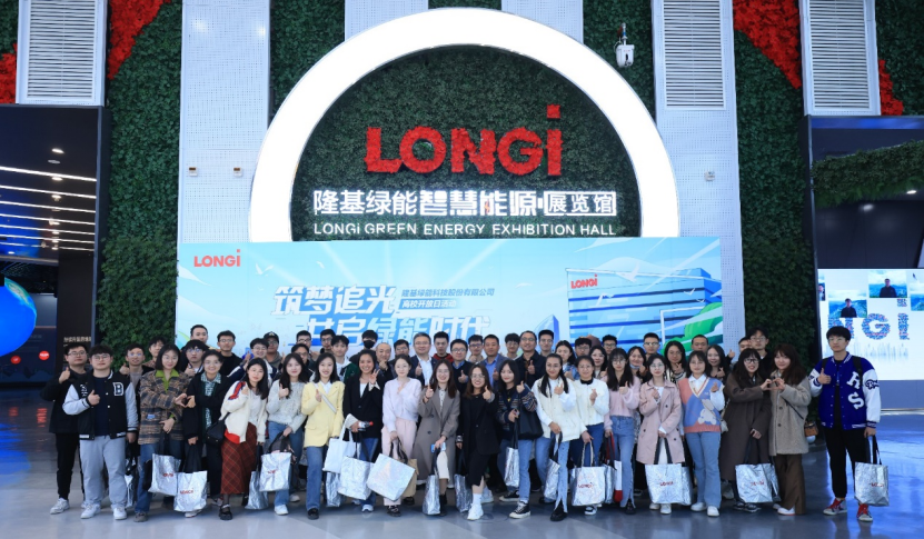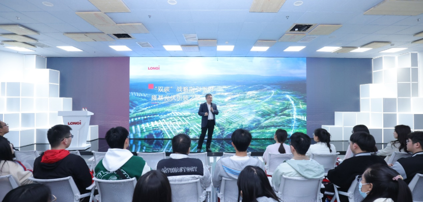 53名碳中和学院学生受邀参观了隆基绿能智慧能源展览馆,系统了解了隆基发展史和光伏产业发展历程。下午,碳中和学院2023年企业首课开讲,隆基绿能品牌总经理霍焱为同学们作了题为“‘双碳’战略下隆基光伏引领之路”的报告,详细介绍了国际、国内“双碳”战略形成的背景和底层逻辑、实现“双碳”目标的路径及难点、光伏实现“双碳”目标的优势,以及隆基绿能成为全球光伏行业领军企业的奋斗历程。