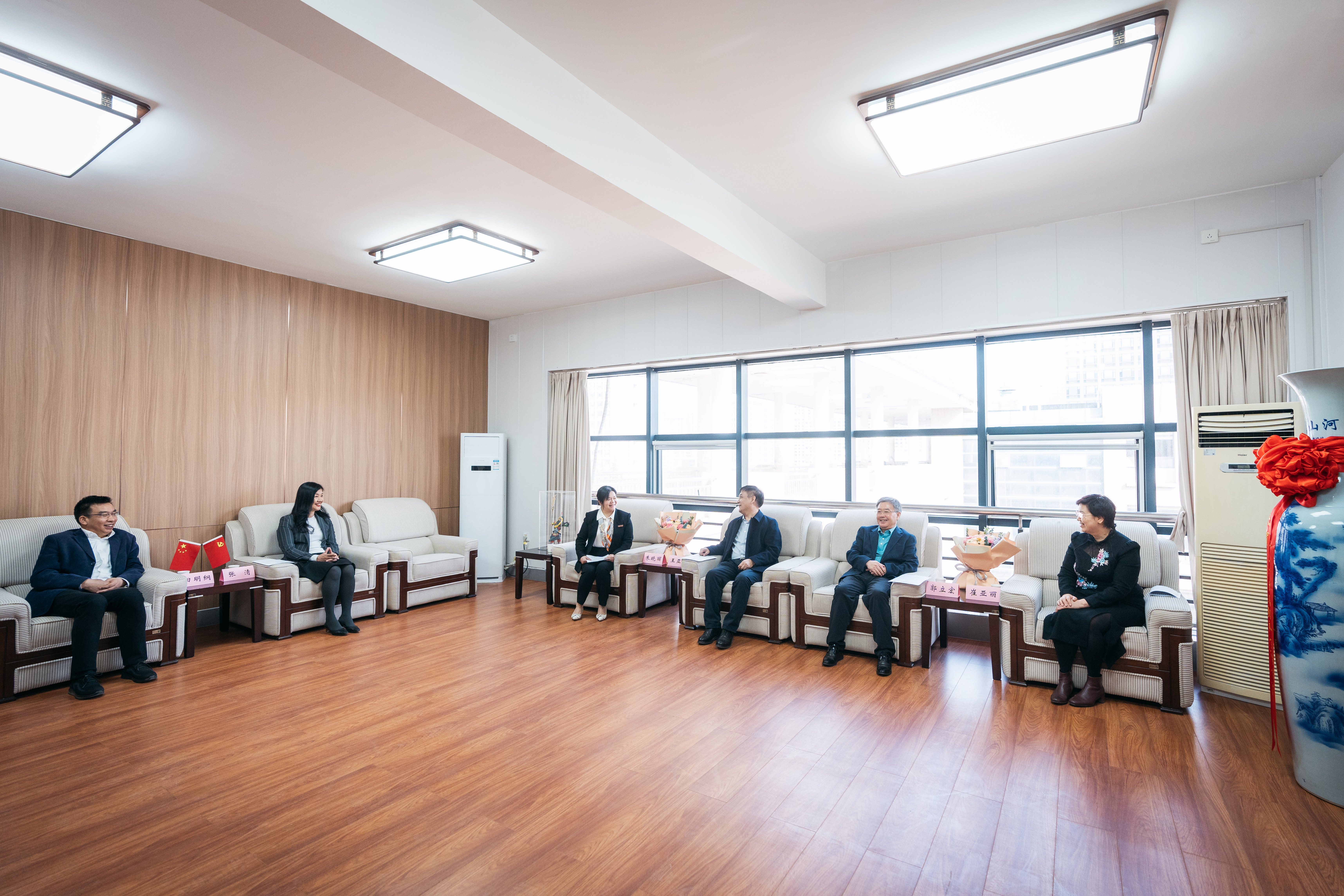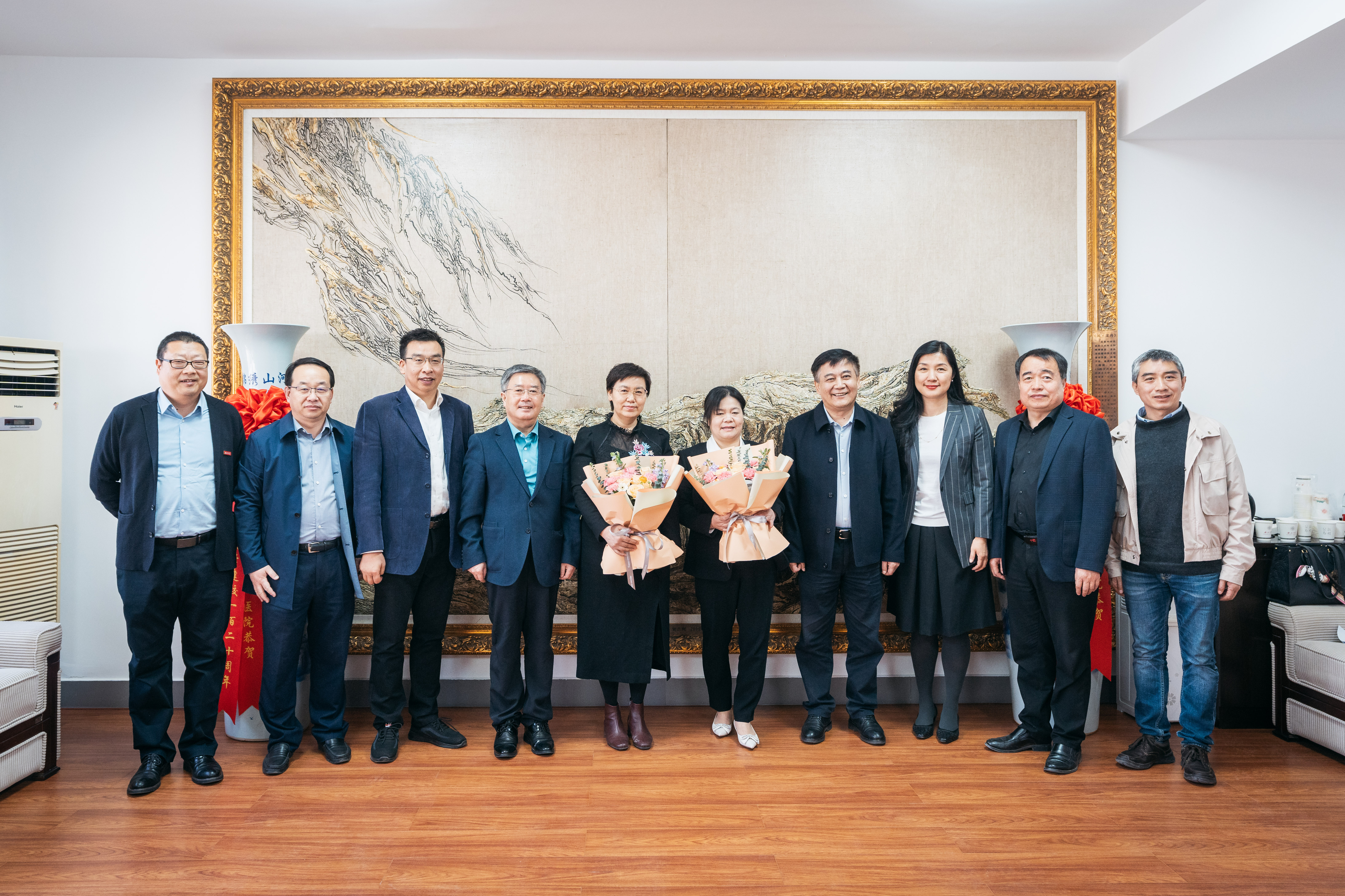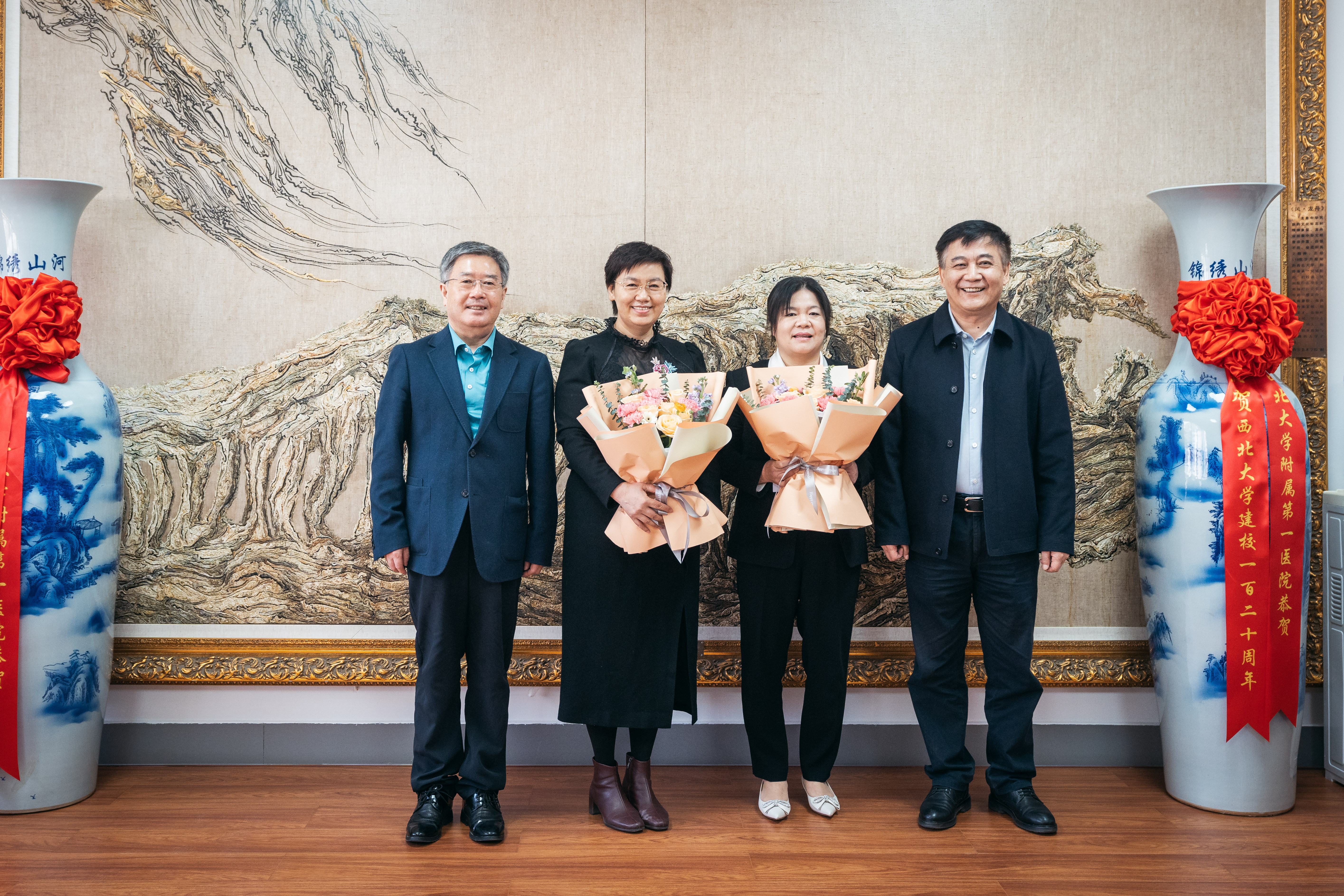 王亚杰、郭立宏向朱晓丽、崔亚丽教授赠送鲜花并合影留念,对她们分别当选第十四届全国人大代表和担任第十四届全国政协委员表示祝贺。