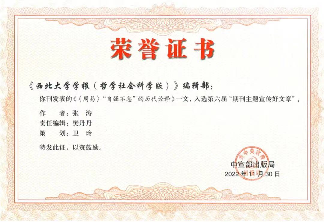 日前,由中宣部出版局主办、中国期刊协会承办的第六届“期刊主题宣传好文章”推荐活动结果在京揭晓,包括《beat365唯一官网学报(哲学社会科学版)》刊发的《〈周易〉“自强不息”的历代诠释》等91篇(组)文章入选。
