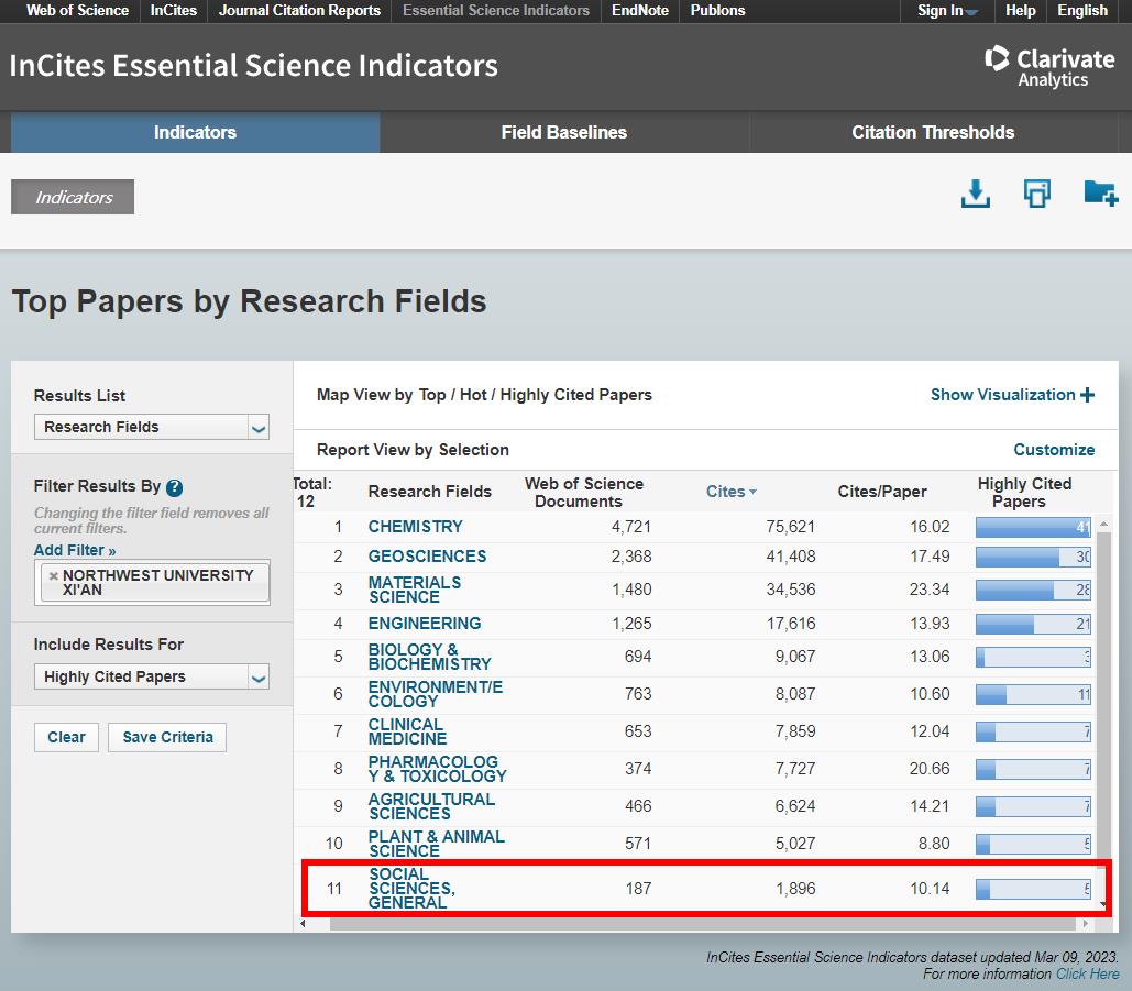 日前,科睿唯安(Clarivate Analytics)更新2023年3月基本科学指标数据库最新数据。beat365官网社会科学总论首次进入全球前1%,学校全球前1%学科数增至11个,包括地球科学、化学、材料科学、工程学、临床医学、药理学与毒理学、农业科学、植物与动物科学、环境/生态学、生物与生物化学、社会科学总论。