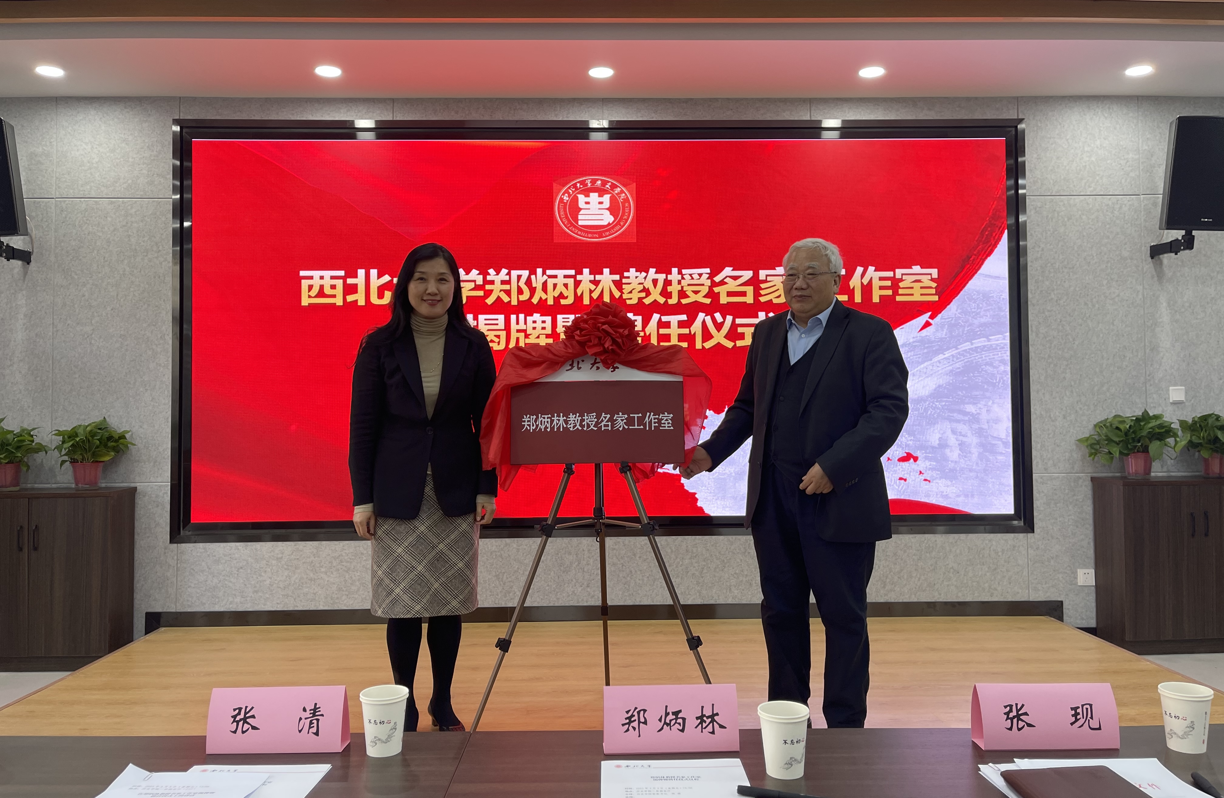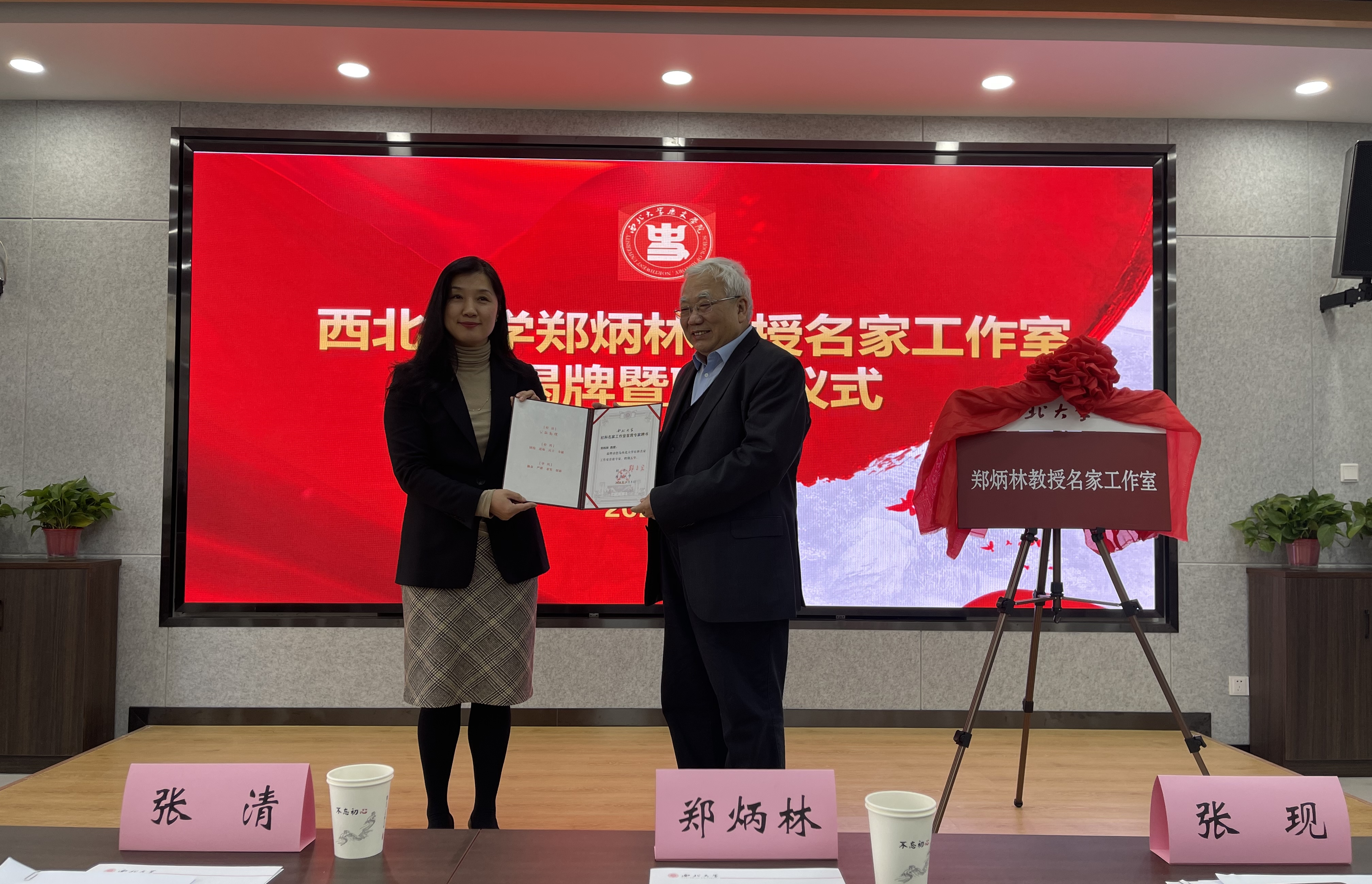 仪式上,人才办负责人宣读了工作室成立文件。张清、郑炳林共同为工作室揭牌,张清向郑炳林颁发了工作室首席专家聘书。