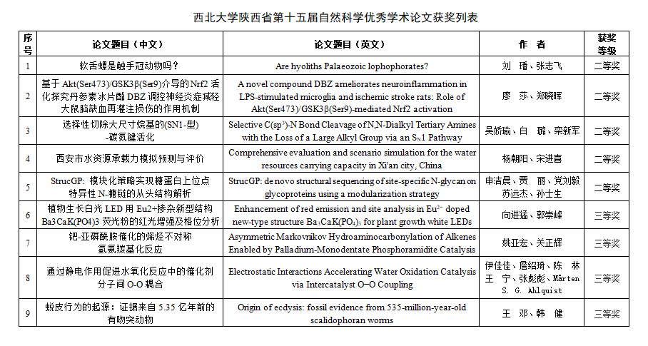 地质学系刘璠博士申报的“软舌螺是触手冠动物吗?”、生命学院廖莎副教授申报的“基于Akt(Ser473)/GSK3β(Ser9)介导的Nrf2活化探究丹参素冰片酯DBZ调控神经炎症减轻大鼠脑缺血再灌注损伤的作用机制”、化材学院白璐副教授申报的“选择性切除大尺寸烷基的(SN1-型)-碳氮键活化”、城环学院宋进喜教授申报的“西安市水资源承载力模拟预测与评价”、生命学院孙士生教授申报的“StrucGP: 模块化策略实现糖蛋白上位点特异性N-糖链的从头结构解析”荣获二等奖。