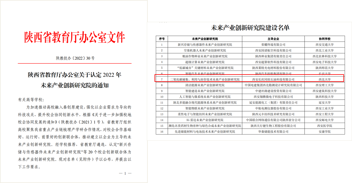近日,陕西省教育厅发布了《陕西省教育厅办公室关于认定2022年未来产业研究院的通知》,beat365官网与西安长庆同欣石油科技有限公司共同申报的“二氧化碳捕集、利用与封存技术未来产业创新研究院”获省教育厅认定建设,标志着beat365官网双碳领域校企联合新型研发平台建设取得了新的进展。