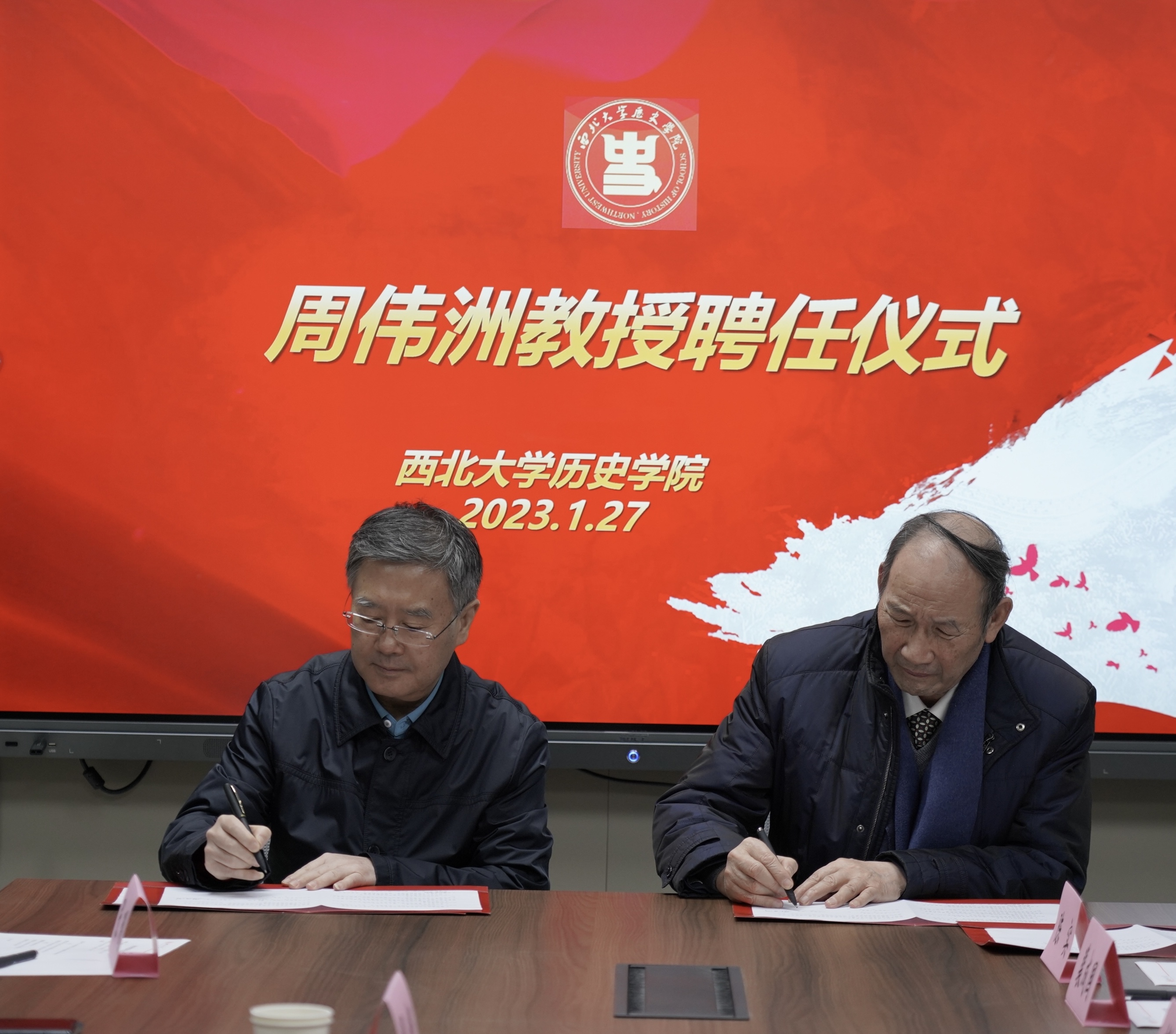 仪式上,人力资源部负责人宣读了学校聘任周伟洲教授担任中国民族史团队首席专家决议,郭立宏和周伟洲教授共同签署协议。
