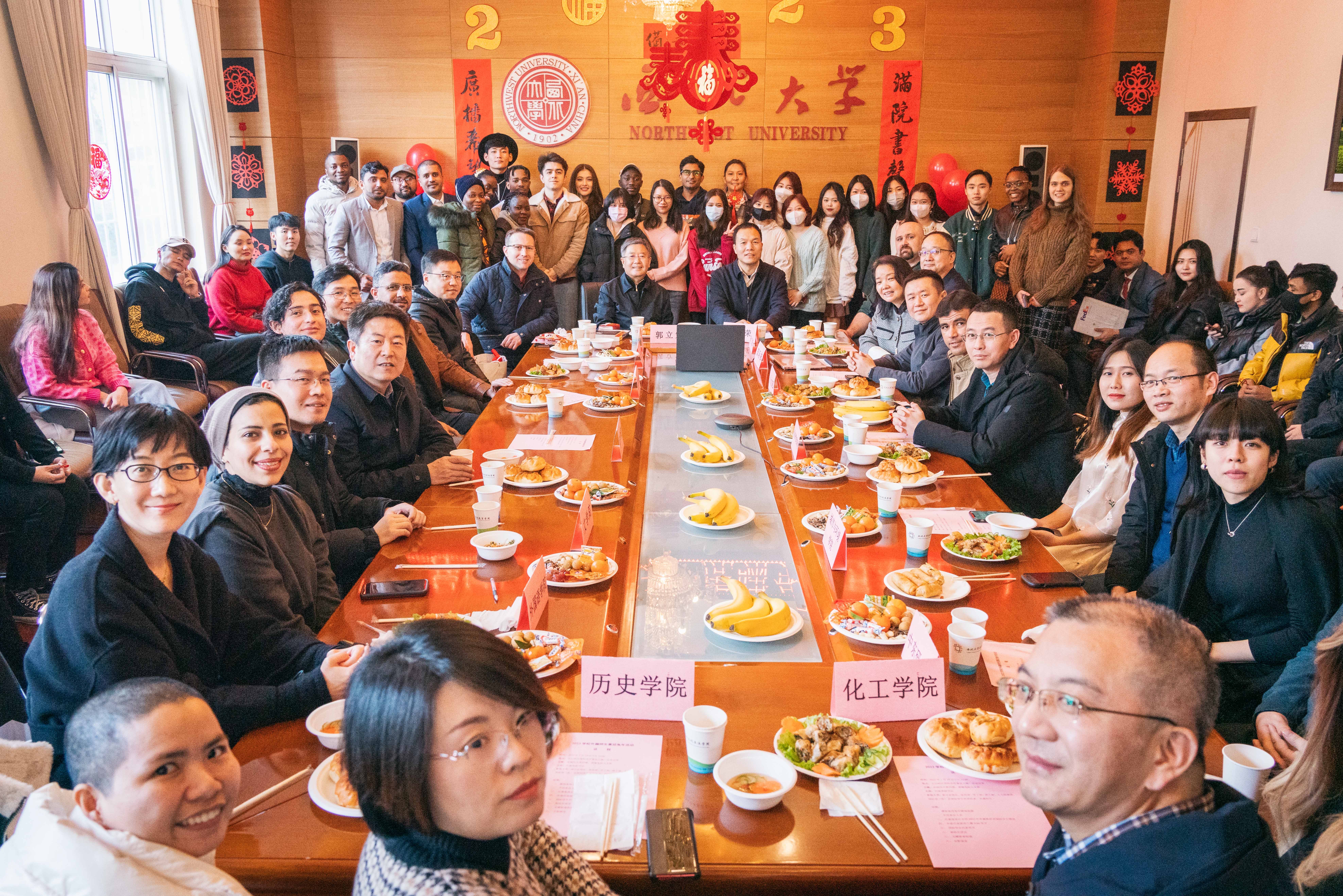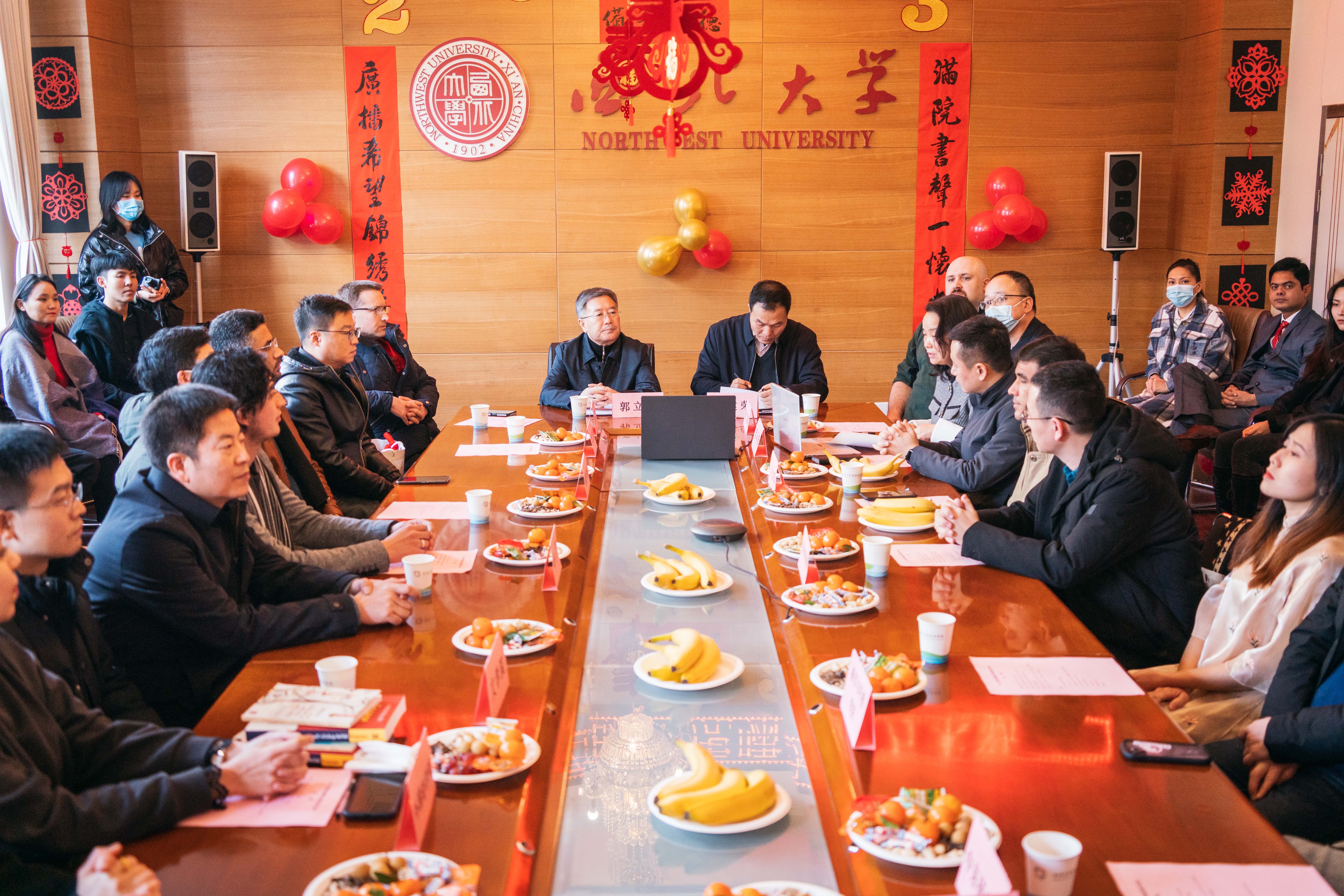 1月19日下午,2023癸卯兔年来临之际,学校举办“异域同天春共暖,虎啸兔跃万木新”2023外籍师生喜迎兔年活动。校长郭立宏、校党委副书记吕建荣带领学校宣传部、学工部、研工部、人力部、国际部(院)和文学院等9个国际学生培养院系负责人,在太白校区看望学校外籍师生并参加活动。